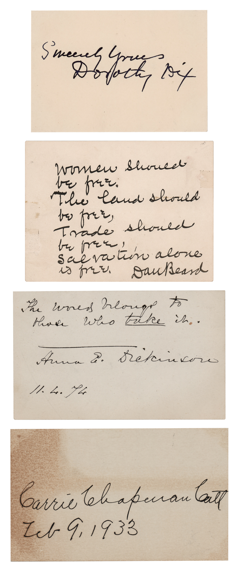 Four items signed by noted suffragists Carrie Chapman Catt (signature), Anna Elizabeth Dickinson (AQS), Dorothea Dix (signature), and Dan Beard (AQS), each penned on off-white cards ranging in size from 3.25 x 2.25 to 4 x 2.5. In overall fine condition, with irregular toning to the Catt card.