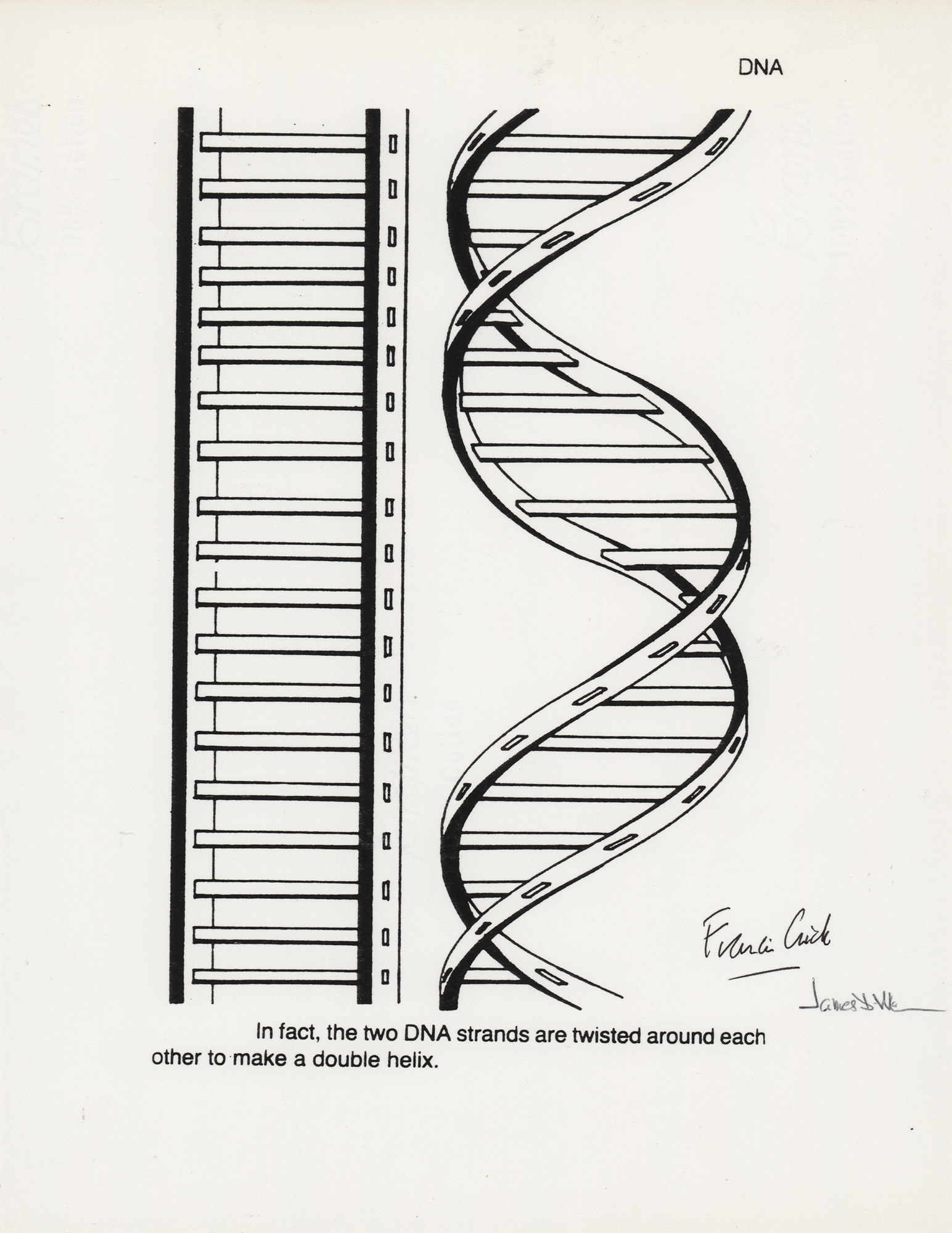 Printed handout sheet 8.5 x 11 containing twisted and non-twisted DNA strands, the latter creating a double helix, signed in the lower right in pencil, “James D. Watson,” and in black ink, “Francis Crick.” In very fine condition.