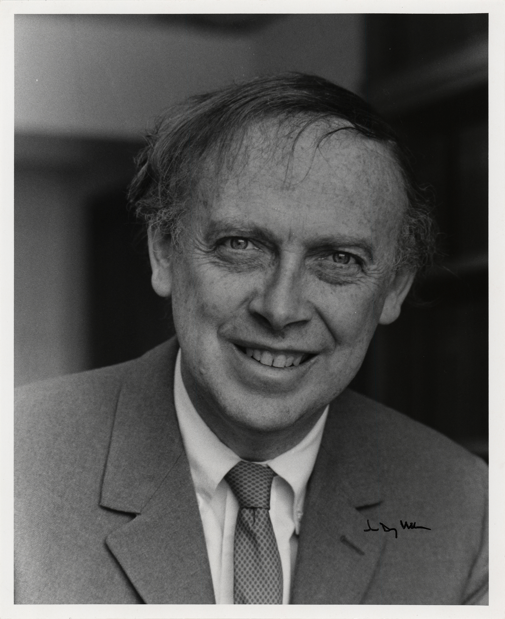 Glossy 8.25 x 10 close-up photo of Nobel Prize-winning geneticist James D. Watson, signed in black felt tip, “James Dewey Watson.” In fine condition, with light surface impressions at the top from notations on the back.