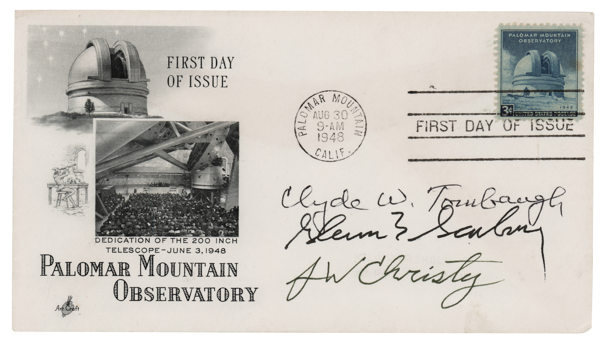 FDC with a cachet honoring the Palomar Mountain Observatory in California, postmarked there on August 30, 1948, signed in black ink and felt tip by noted scientists Clyde W. Tombaugh, James W. Christy, and Glenn Seaborg, whose individual careers are inextricably linked to the dwarf planet Pluto: Tombaugh discovered Pluto, Christy discovered Charon, the largest moon of Pluto, and Seaborg named the newly created element plutonium after Pluto. In very fine condition.
