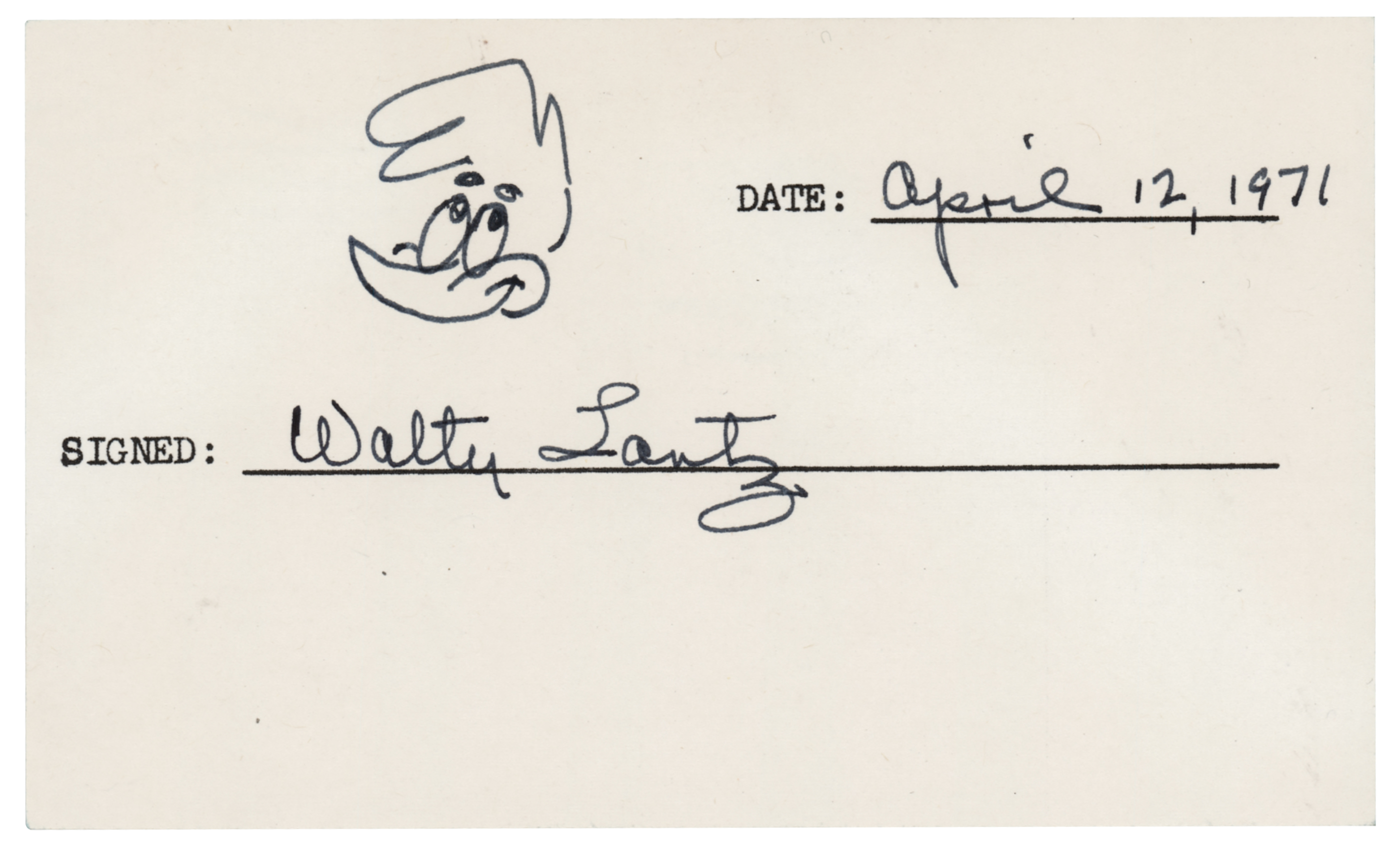 Original sketch of Woody Woodpecker by Walter Lantz, accomplished in black ink on an off-white 5 x 3 card, which is signed and dated, “Walty Lantz, April 12, 1971.” In very fine condition. Accompanied by the original mailing envelope.