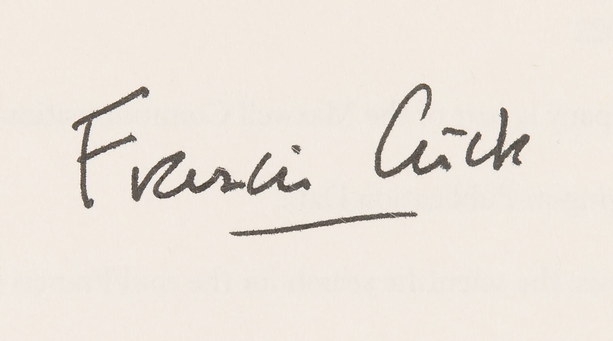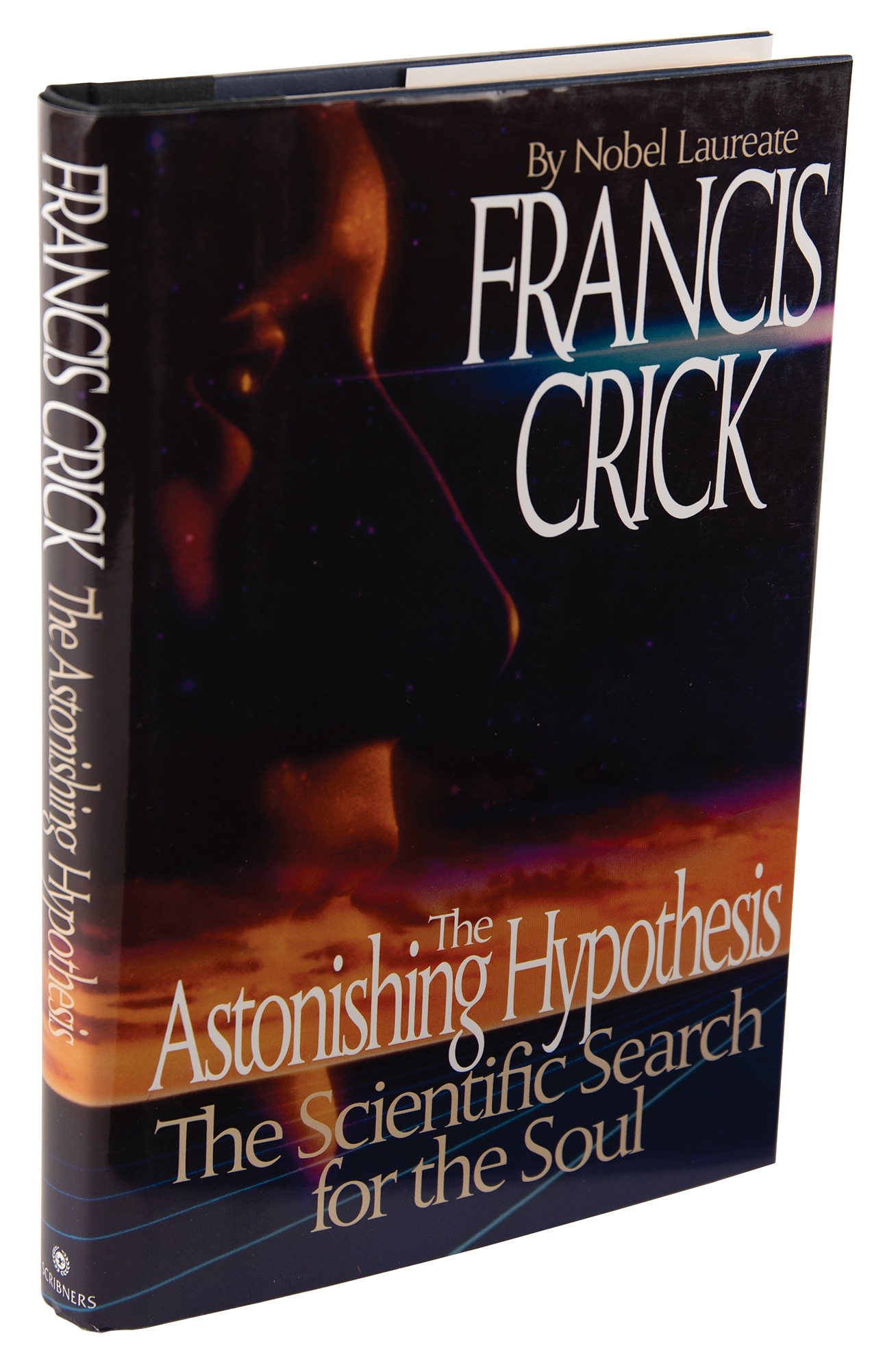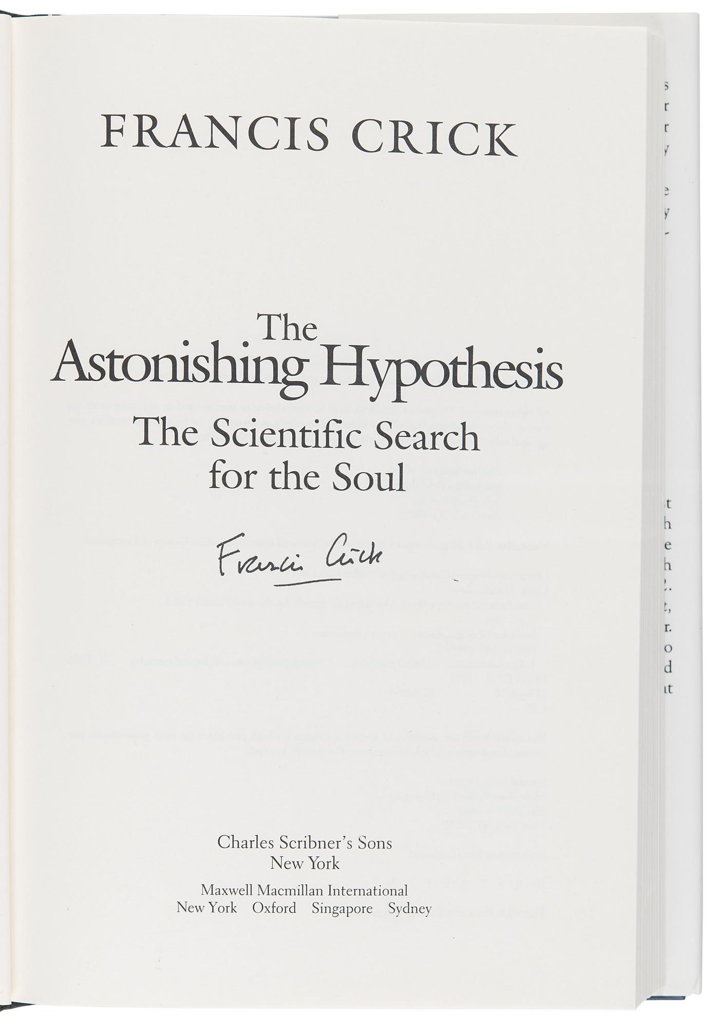Signed book: The Astonishing Hypothesis: The Scientific Search for the Soul. First edition. NY: Charles Scribner's Sons, 1994. Hardcover with dust jacket, 6.5 x 9.5, 317 pages. Signed neatly on the title page in black ink by Francis Crick. In fine condition.