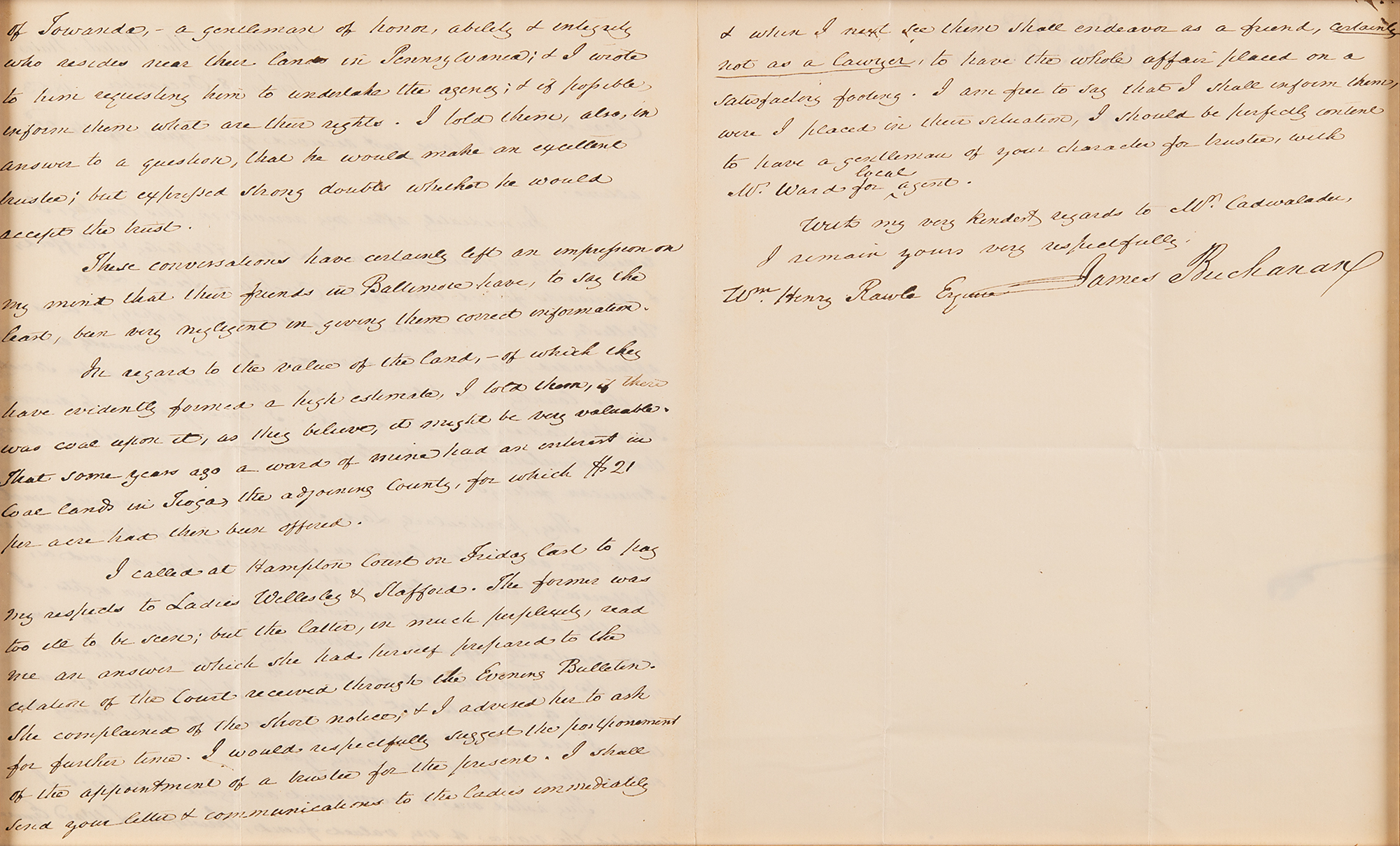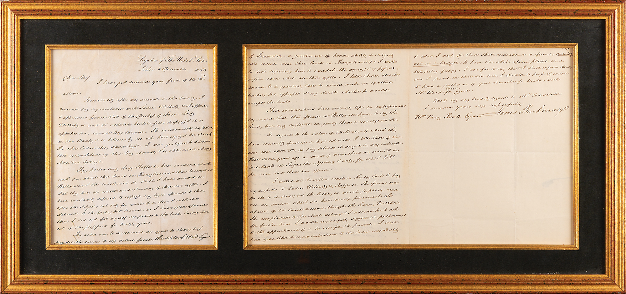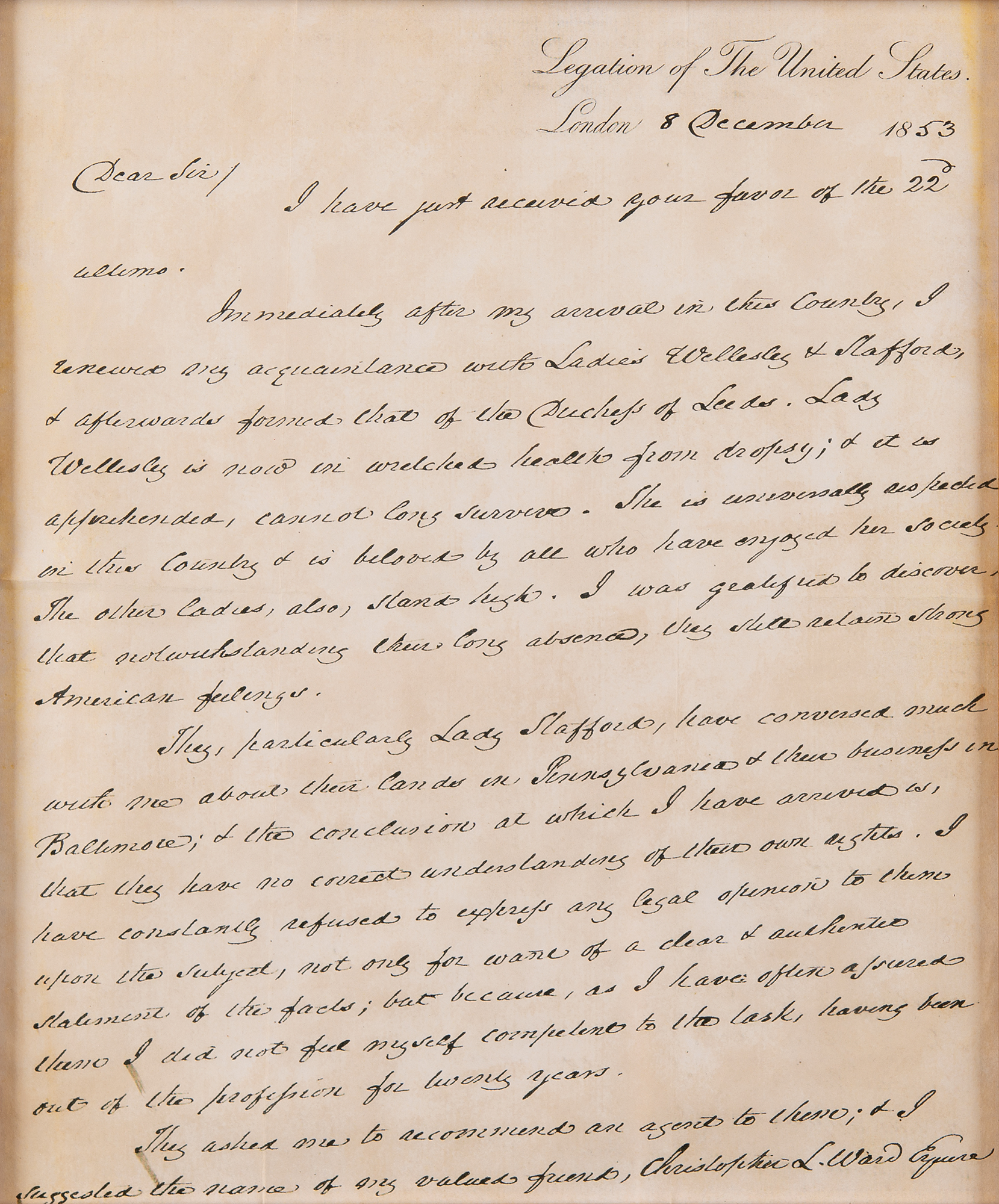 ALS, three pages on two adjoining sheets, 7.25 x 8.5, Legation of the United States at London letterhead, December 8, 1853. Handwritten letter to a William Henry Rawle, in part: "Immediately after my arrival in this country, I renewed my acquaintance with Ladies Wellesley & Stafford, & afterwards formed that of the Duchess of Leeds. Lady Wellesley is now in wretched health from dropsy; & it is apprehended, cannot long survive…The other ladies, also, stand high. I was gratified to discover that notwithstanding their long absence, they still retain strong American feelings. They, particularly Lady Stafford, have conversed much and write me about their lands in Pennsylvania…the conclusion at which I have arrived is, that they have no correct understanding of their rights. I have constantly refused to express any legal opinion to them upon the subject, not only for want of a clear & authentic statement of the facts; but because, as I have often assured them I did not feel myself confident to the task, having been out of the profession for twenty years…In regard to the value of the land,—of which they have evidently formed a high estimate, I told them, if there was coal upon it, as they believe, it might be very valuable…When I next see them shall endeavor as a friend, certainly not as a lawyer, to have the whole affair placed on a satisfactory footing." Attractively matted and framed with a photocopy of the front of the letter to an overall size of 27.5 x 13. In fine condition. Accompanied by a full letter of authenticity from JSA.