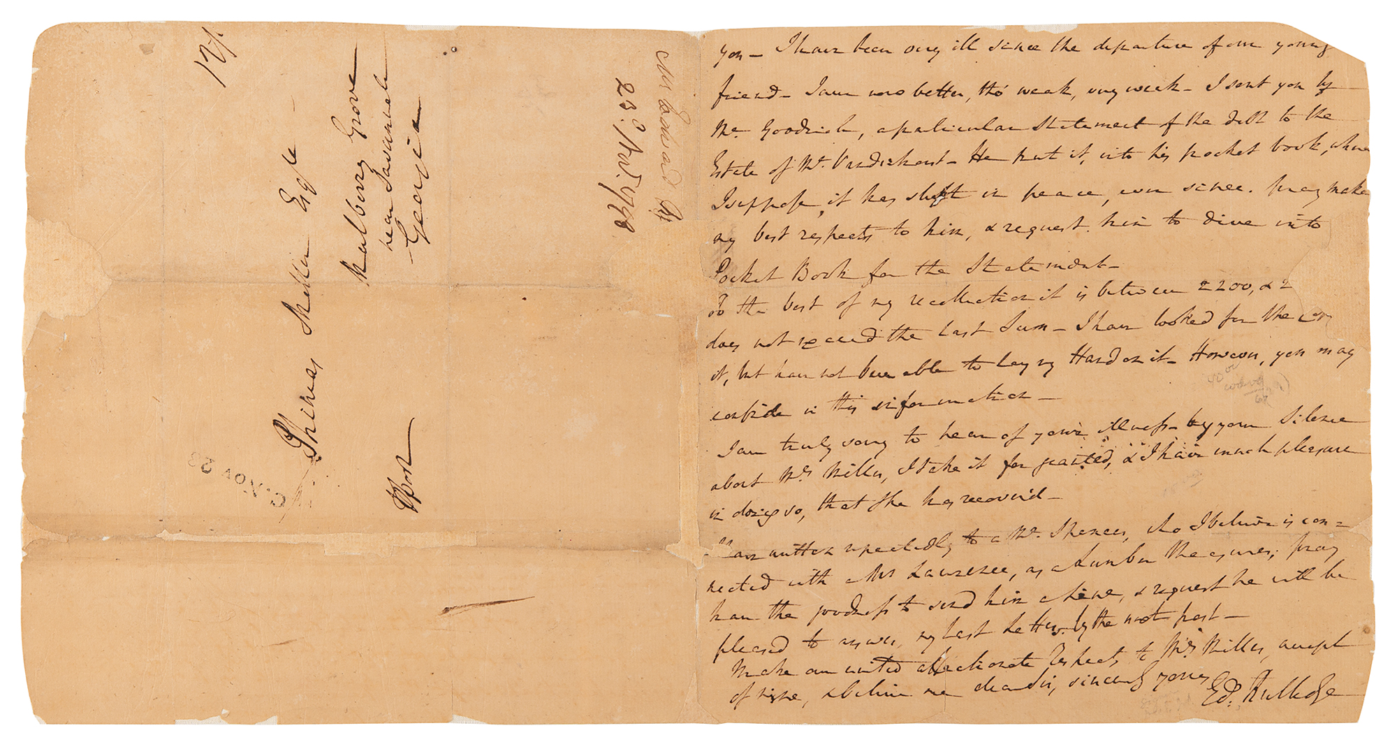 American politician from South Carolina who was the youngest signer of the Declaration of Independence (1749–1800). Partial ALS signed “Ed: Rutledge,” one page, 8 x 8.5, November 23, 1798. Partial handwritten letter to Phineas Miller, in part: "I have been very ill since the departure of one young friend—I am now better, tho' weak, very weak. I sent you by Mr. Goodrich, a particular statement of the debt to the Estate…He put it into his pocket book, where I suppose, it has slept in peace, ever since. Pray make my best respects to him, & request him to dive into Pocket Book for the statement." Addressed on the integral leaf in Rutledge's hand. In very good condition, with old repairs to areas of paper loss (affecting some words in the text) and professionally silked on the reverse. Accompanied by a full letter of authenticity from PSA/DNA.