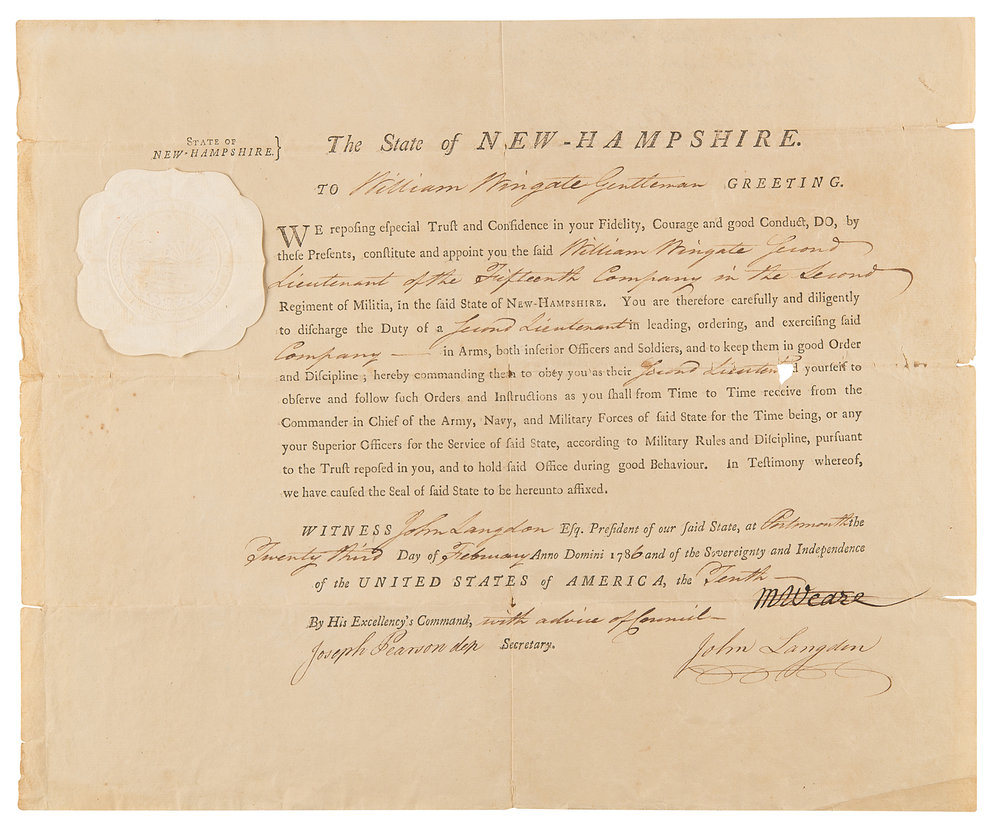Partly-printed DS, signed "M. Weare" and "John Langdon," one page, 15 x 12.25, February 23, 1786. As governor of New Hampshire, John Langdon appoints William Wingate as "Second Lieutenant of the Fifteenth Company in the Second Regiment of Militia." Boldly signed at the conclusion in ink by New Hampshire's first governor, Meshech Weare, whose signature has been struck through, and signed below by John Langdon. Countersigned by Joseph Pearson as deputy secretary. The embossed white paper seal affixed at the upper left remains intact. In very good to fine condition, with scattered small areas of paper loss along the intersecting folds. Accompanied by a full letter of authenticity from JSA.
