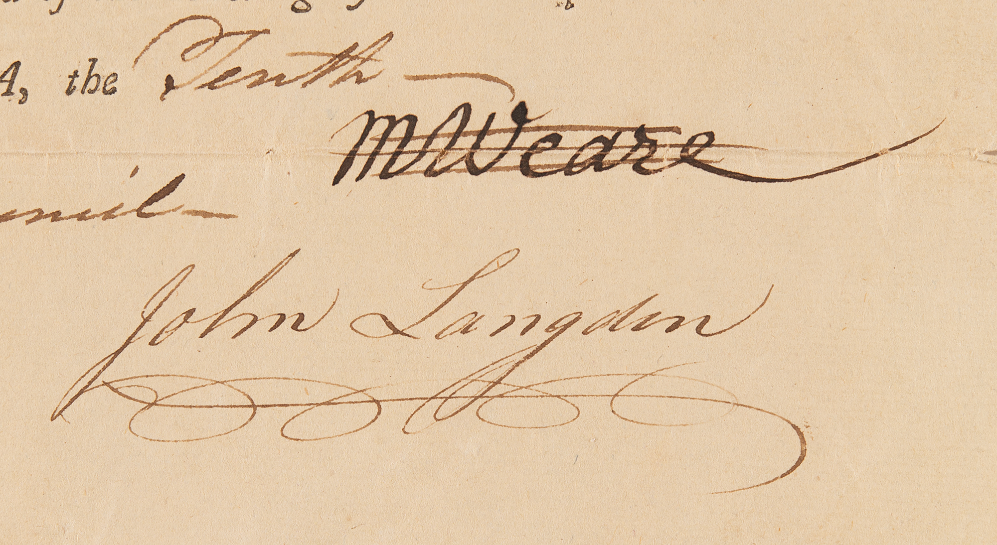Meshech Weare served as the first governor of New Hampshire—a position then referred to as 'president'—from June 15, 1784 to June 1, 1785, and evidently signed these blank militia appointments en masse for later use. His successor, John Langdon, served four non-consecutive terms as governor of New Hampshire between 1785 and 1812. Langdon also served as a delegate to the Constitutional Convention, signed the United States Constitution, and was one of the first two United States senators from New Hampshire.