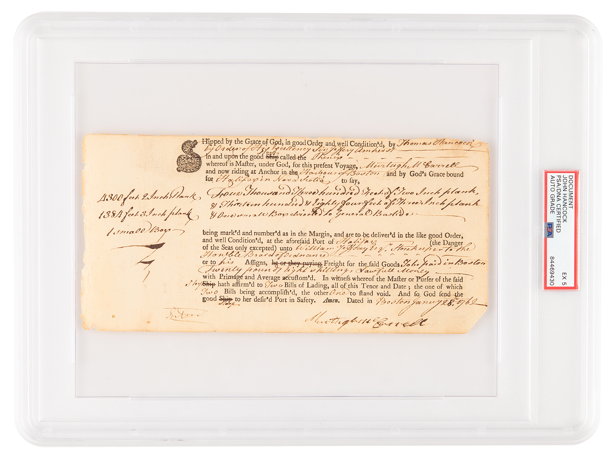 Partly-printed third-person document filled out by John Hancock, signed within the text on behalf of his uncle, "Thomas Hancock," one page, 9 x 4.5, January 28, 1762. A bill of lading, mostly filled out by Hancock, in part: "Shipped by the Grace of God, in good Order and well Condition'd, by Thomas Hancock, By Order of His Excellency Sir Jeffrey Amherst….upon the good Sloop called the Phenix…now riding at Anchor in the Harbour of Boston and by God's Grace bound for Halifax in Nova Scotia, to say, Four Thousand Three hundred Feet of Two Inch plank, & Thirteen hundred & Eighty four feet of Three Inch plank & One small Box directed to General Bastide." In fine condition, with a slightly rough top edge affecting the "Hancock" last name. Encapsulated and graded by PSA/DNA as "EX 5."