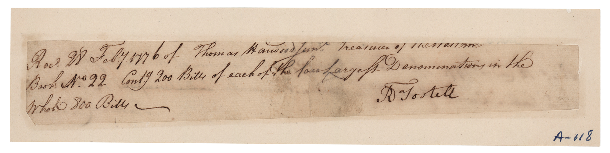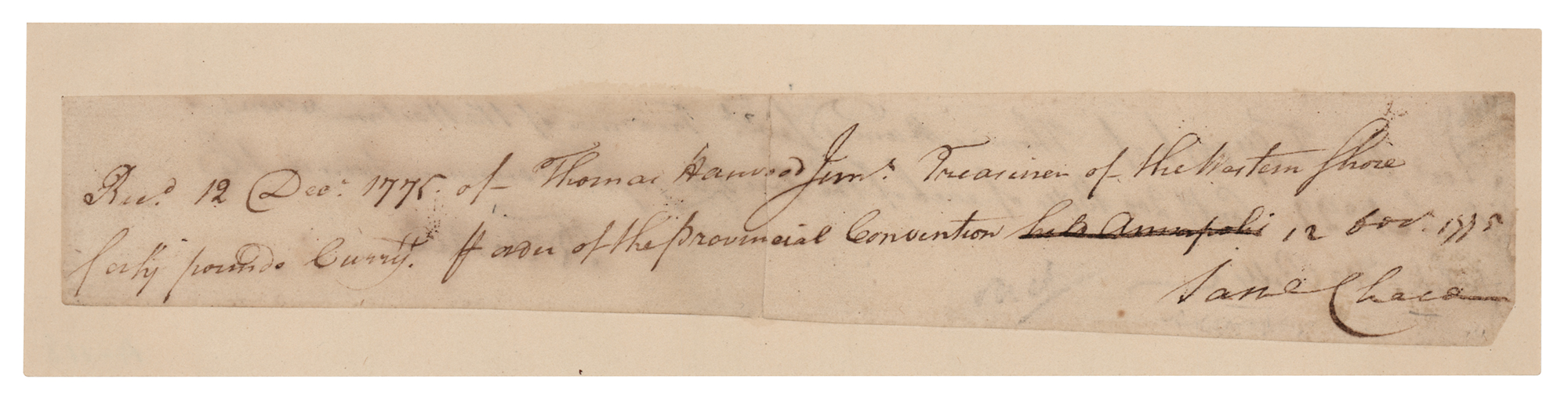Signer of the Declaration of Independence from Maryland (1741-1811) and Associate Justice of the Supreme Court from 1796 until his death. Partial self-contained ADS signed "Sam'l Chase," one page, 8 x 1.25, December 12, 1775. Chase writes out a financial receipt, in full: "Recd. 12 Dec. 1775 of Thomas Harwood Junr. Treasurer of the Western Shore forty pounds Curre'tt of order of the Provincial Convention." On the reverse is a manuscript record of Harwood sending payment to the Convention, signed by "R. Tootell." Professionally inlaid into a slightly larger sheet and in fine condition. Accompanied by a certificate of authenticity from University Archives.