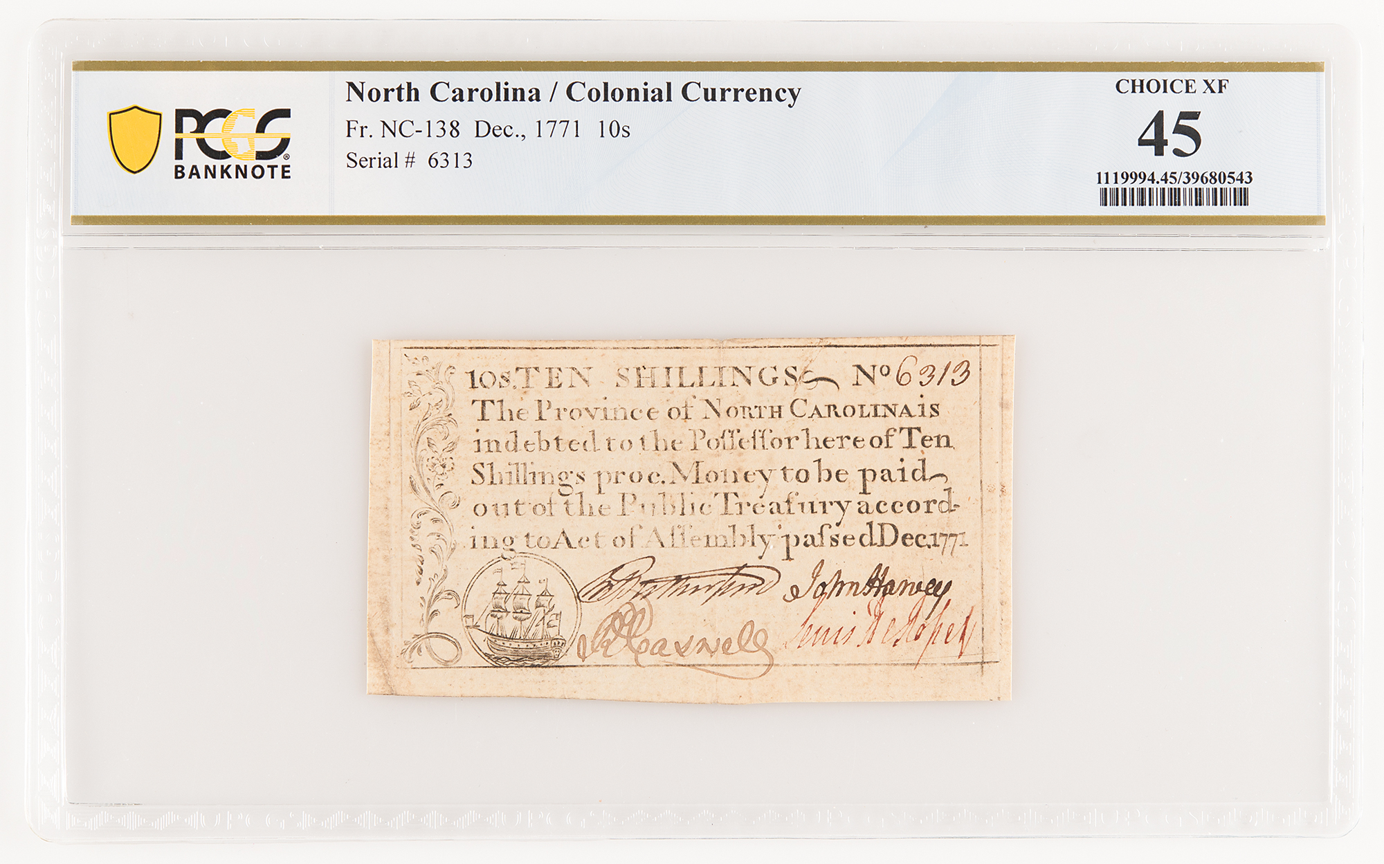 Politician and lawyer (1729–1789) who served as the first and fifth governor North Carolina; as a delegate to the First Continental Congress, he was a signatory of the 1774 Continental Association. Colonial North Carolina engraved bank note for "Ten Shillings," 4 x 2.25, issued as No. 6313, and reading: "The Province of North Carolina is indebted to the Possessor hereof Ten Shillings proc. Money to be paid out of the Public Treasury according to an Act of Assembly passed Dec. 1771." Signed at the conclusion in ink by Richard Caswell, "R. Caswell," and countersigned by three others. Encapsulated and graded by PCGS as "Choice XF 45."