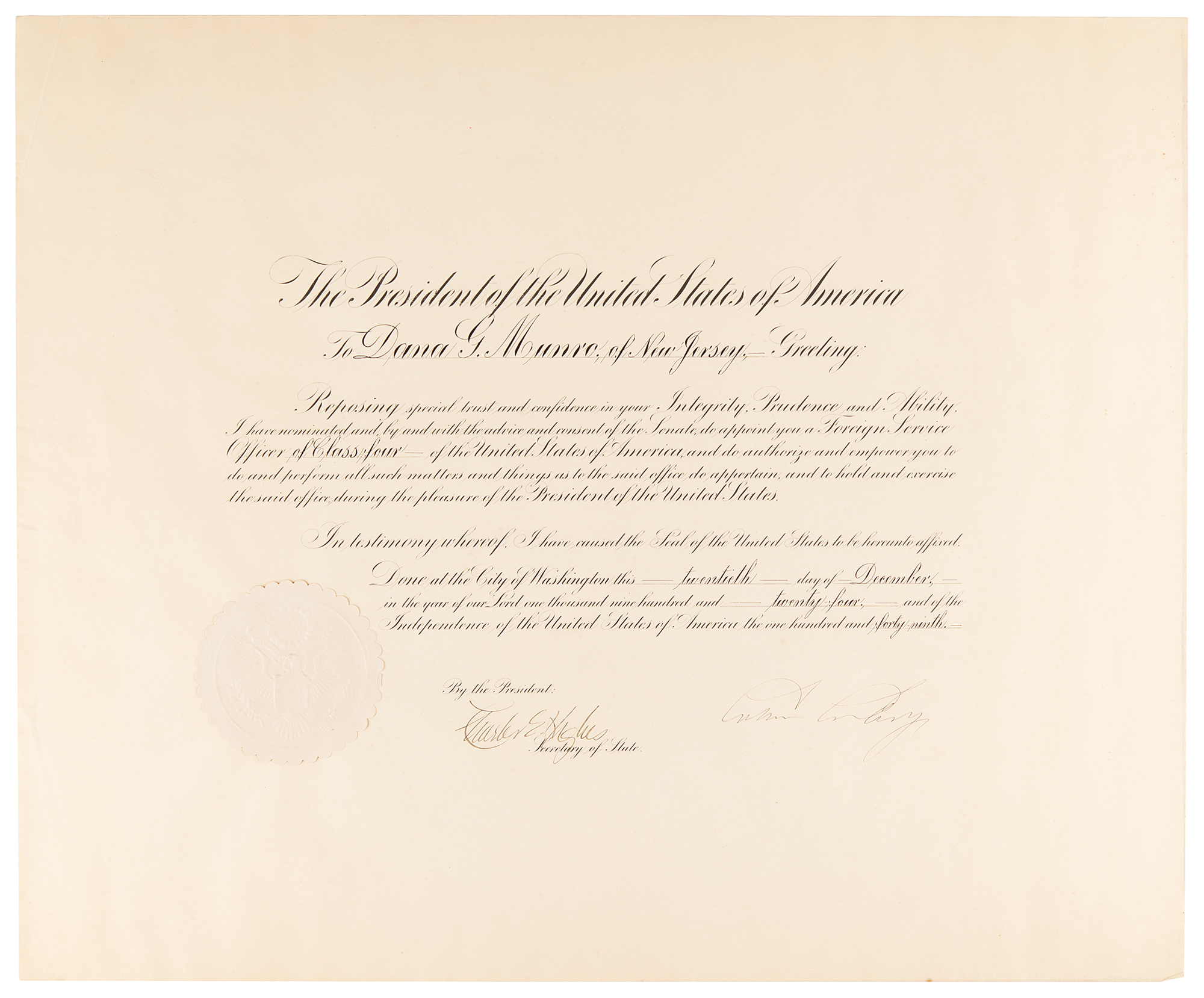 Partly-printed DS as president, one page, 19" x 23", December 20, 1927. President Coolidge appoints Dana G. Munro of New Jersey as "a Foreign Service Officer of Class four of the United States of America." Crisply signed at the conclusion in ink by President Calvin Coolidge and countersigned by Secretary of State Charles Evans Hughes. The embossed white paper seal affixed at the lower left remains intact. In fine condition. Accompanied by a full letter of authenticity from JSA. During his twelve years with the State Department, Munro served as a special envoy to Haiti, charge d'affairs in Managua, consul to Chile, and as head of the Latin American division; he later joined the faculty at Princeton University as a professor of Latin American history.