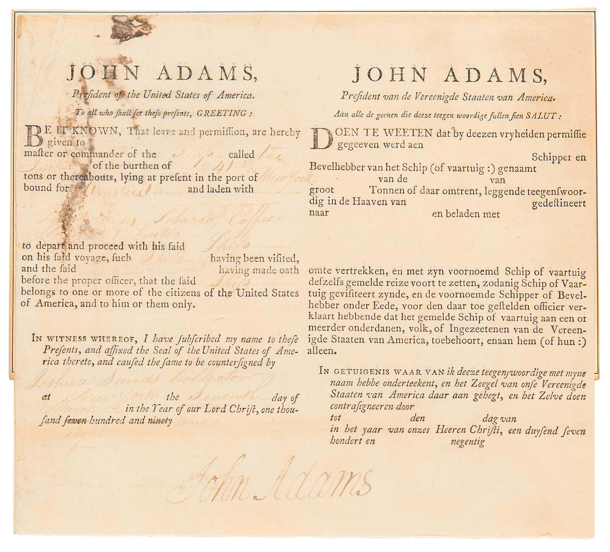 Partly-printed DS as president, one page, 8.25 x 7.5, March 7, 1801. English and Dutch section of four-language ship's papers issued to "the Ship called the Joseph…lying at present in the port of New York bound for Amsterdam," and laden with products including tobacco and coffee." Neatly signed at the conclusion in ink by President John Adams. Trimmed, affixed by its top edge to a smaller card, and in fine condition, with Adams signature a bit light, other handwritten portions lighter, and some scattered staining to the upper left corner. Accompanied by a certificate of authenticity from University Archives. Interestingly, Adams had resided in Amsterdam during his time as the first United States Minister to the Netherlands, a capacity in which he served from 1782 to 1788.