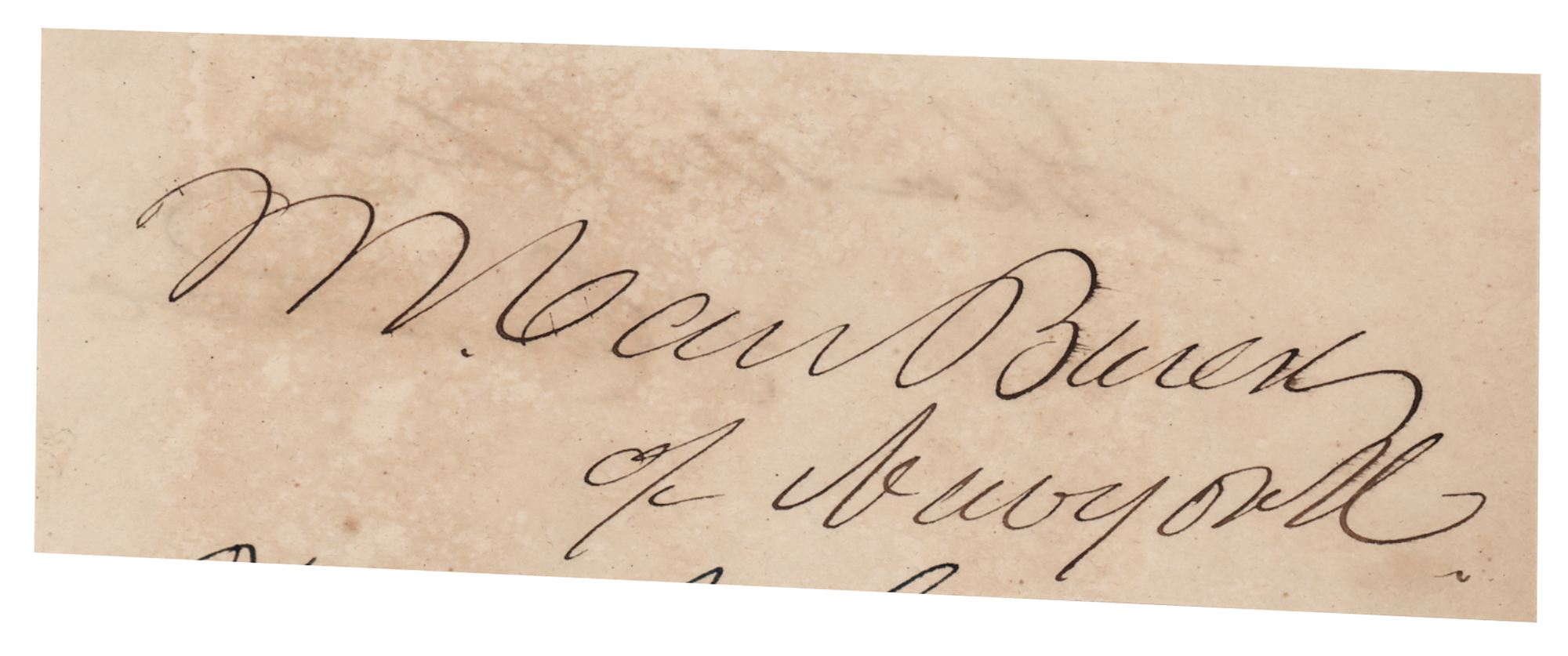 Neat ink signature, "M. Van Buren of New York,” on an off-white 4.75 x 1.75 slip. Affixed to a same-size card and in fine condition. Accompanied by a full letter of authenticity from Beckett Authentication Services.