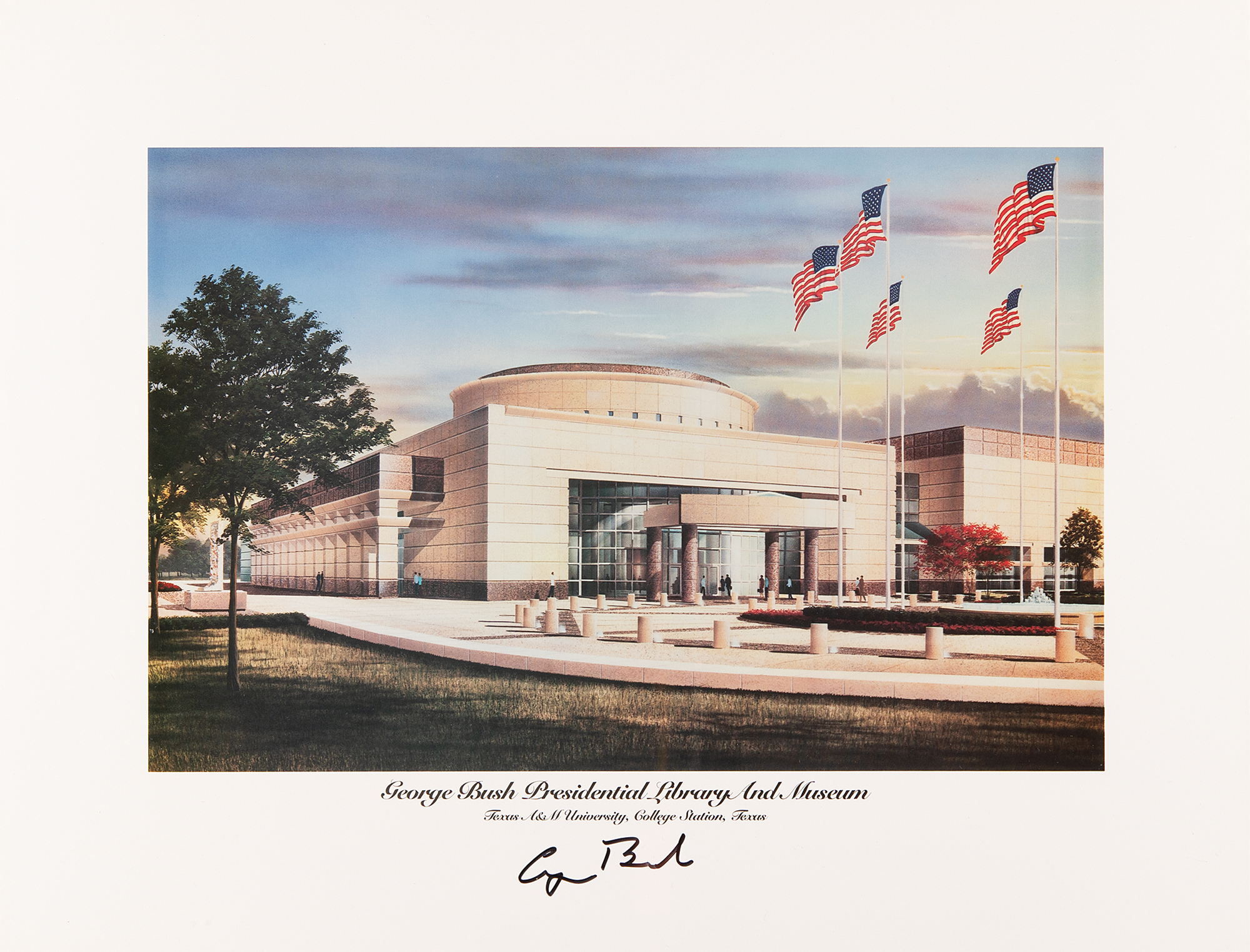 Color 17 x 13 print of the George Bush Presidential Library and Museum at Texas A&M University, signed in the lower border in black felt tip by George Bush. In fine condition. Accompanied by a certificate of authenticity from the museum store.