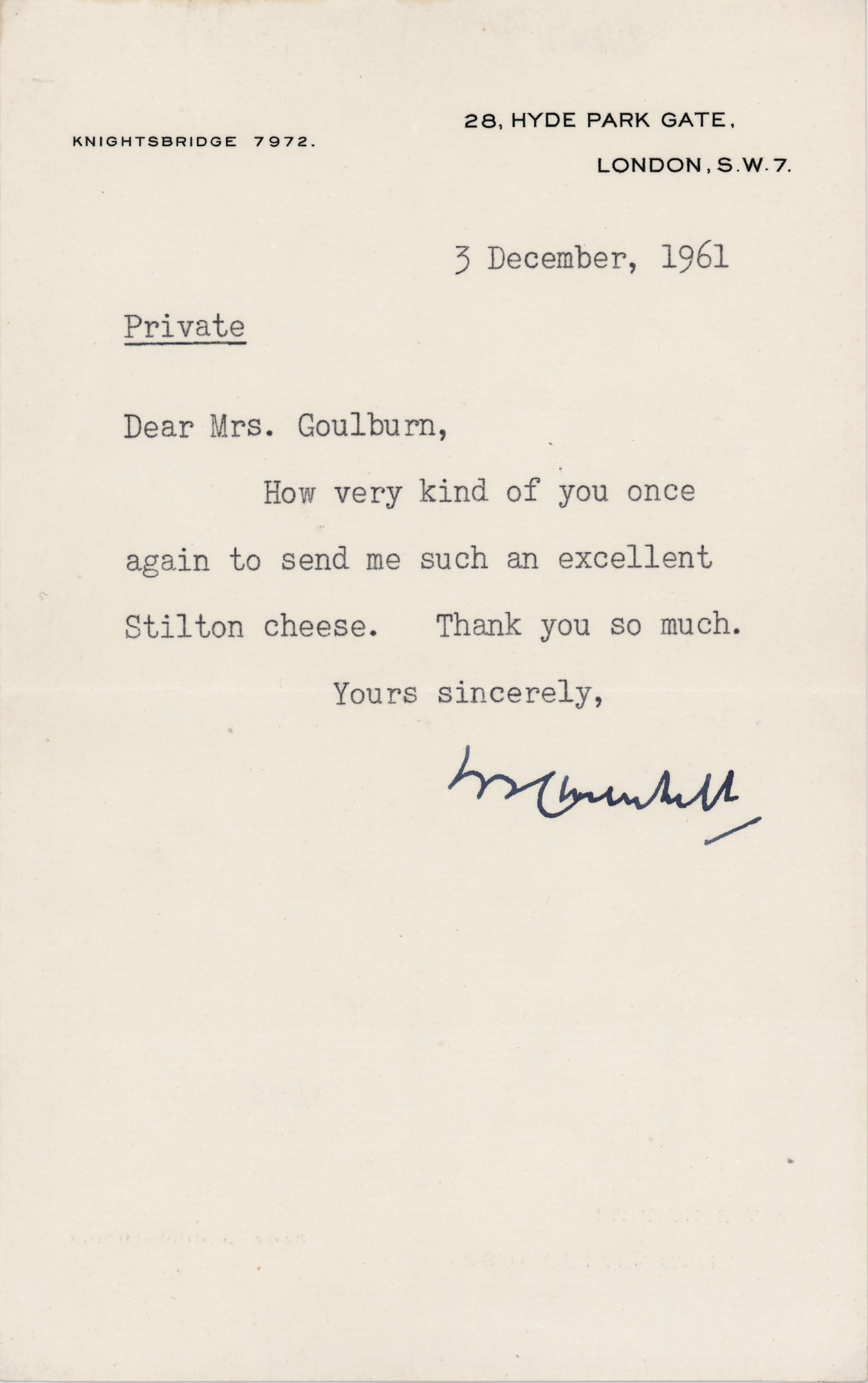 TLS as Father of the House of Commons, signed “W. S. Churchill,” one page, 5 x 8, 28 Hyde Park Gate letterhead, December 3, 1961. Marked “Private,” a letter to Mrs. Goulburn, in full: “How very kind of you once again to send me such an excellent Stilton cheese. Thank you so much.” In fine condition.