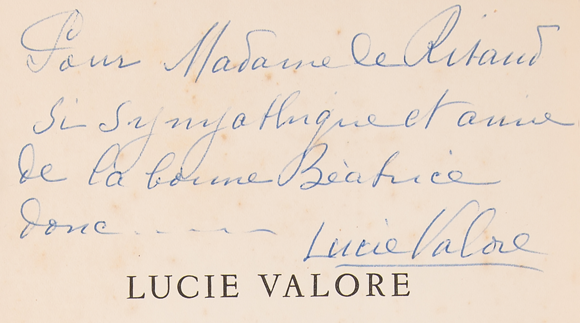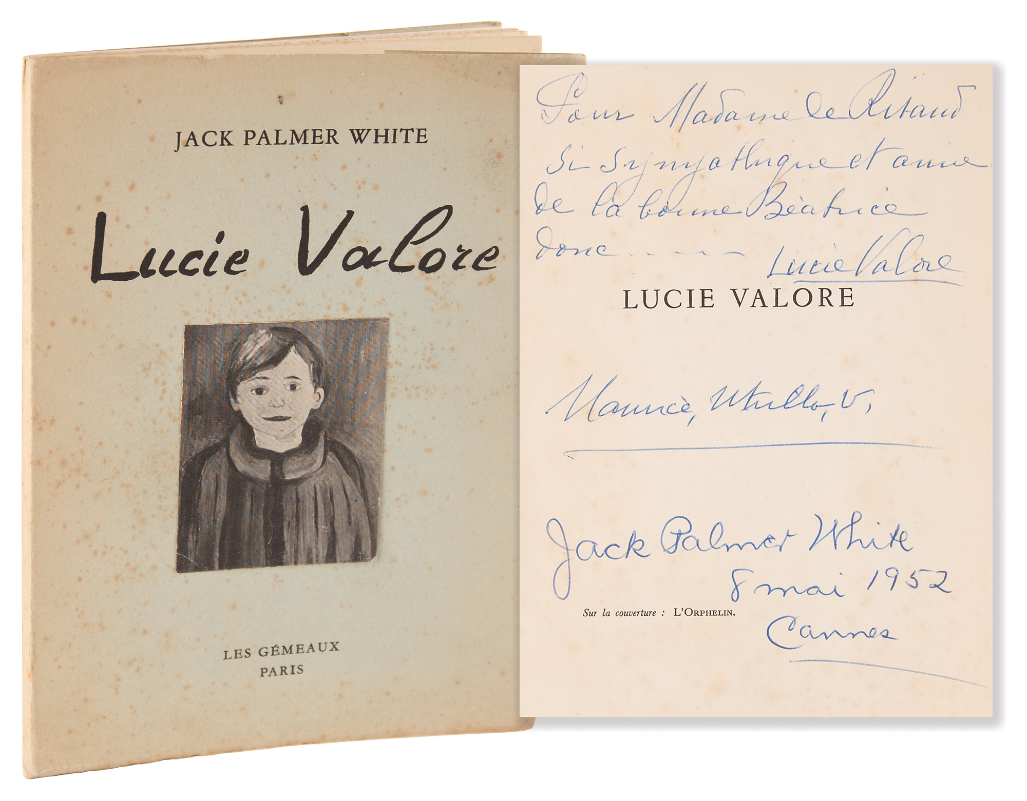 Scarce art catalog of Lucie Valore's paintings, published by Editions Les Gemeaux of Paris in 1952, 28 pages, 5.5 x 7.5, signed and inscribed on the half-title page in blue ballpoint by Lucie Valore, her husband Maurice Utrillo, and author Jack Palmer White. The catalog includes a portrait by Valore, which depicts Utrillo while painting his iconic views in Paris. In very good to fine condition, with sunning to the spine, and scattered light foxing to the cover, signed page, and several beginning pages.