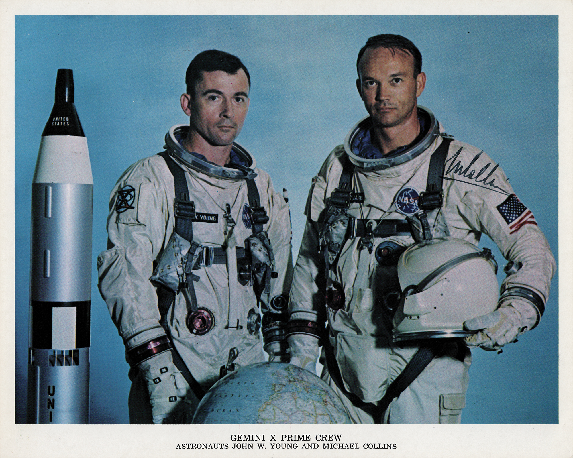 Official color 10 x 8 NASA lithograph of the Gemini 10 crew posing in their flight suits next to a large rocket model, signed in black ink, “M. Collins.” In very fine condition.