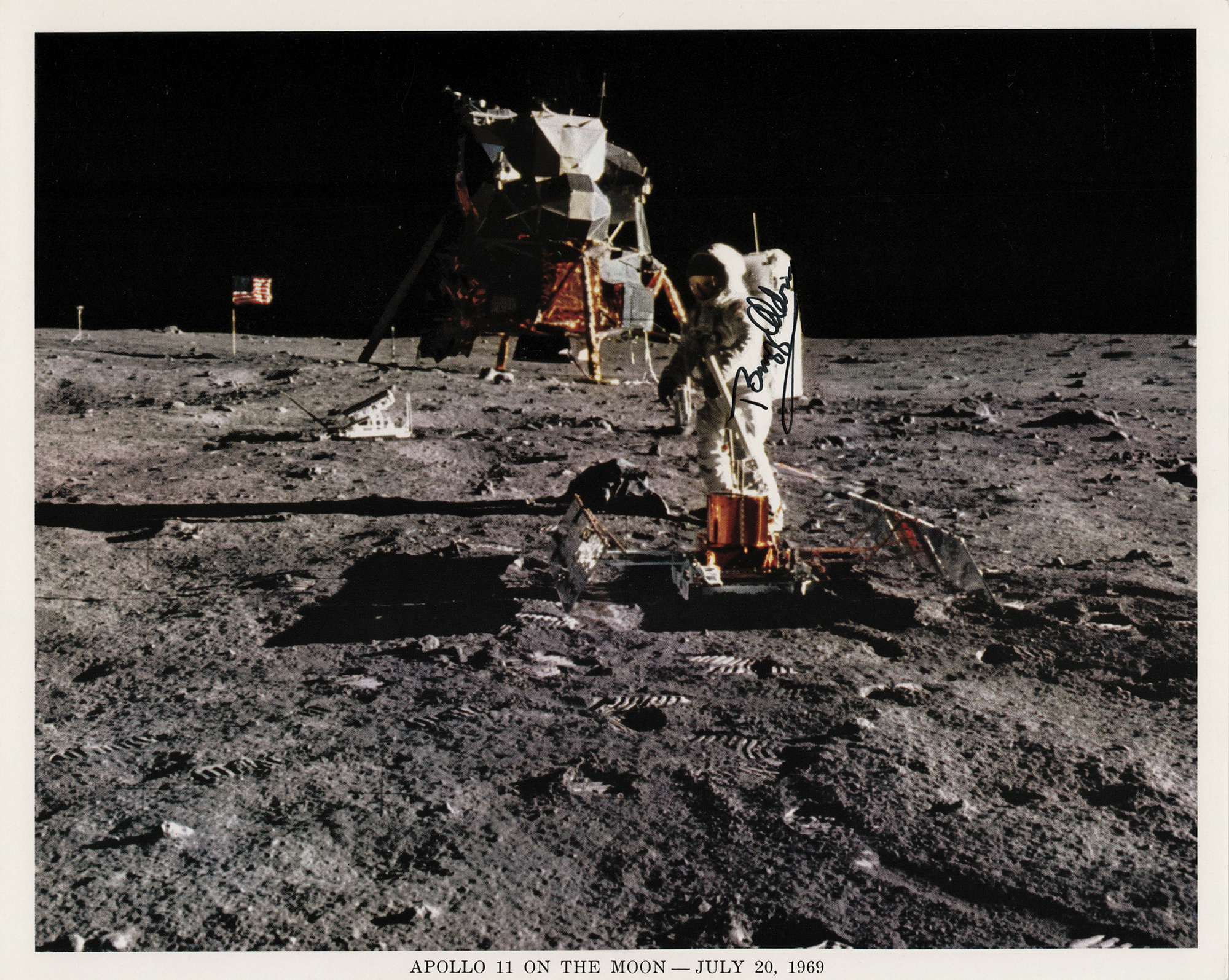 Official color 10 x 8 NASA lithograph of LMP Aldrin deploying the Early Apollo Scientific Experiments Package during the Apollo 11 mission, signed in black felt tip by Buzz Aldrin. In very fine condition.