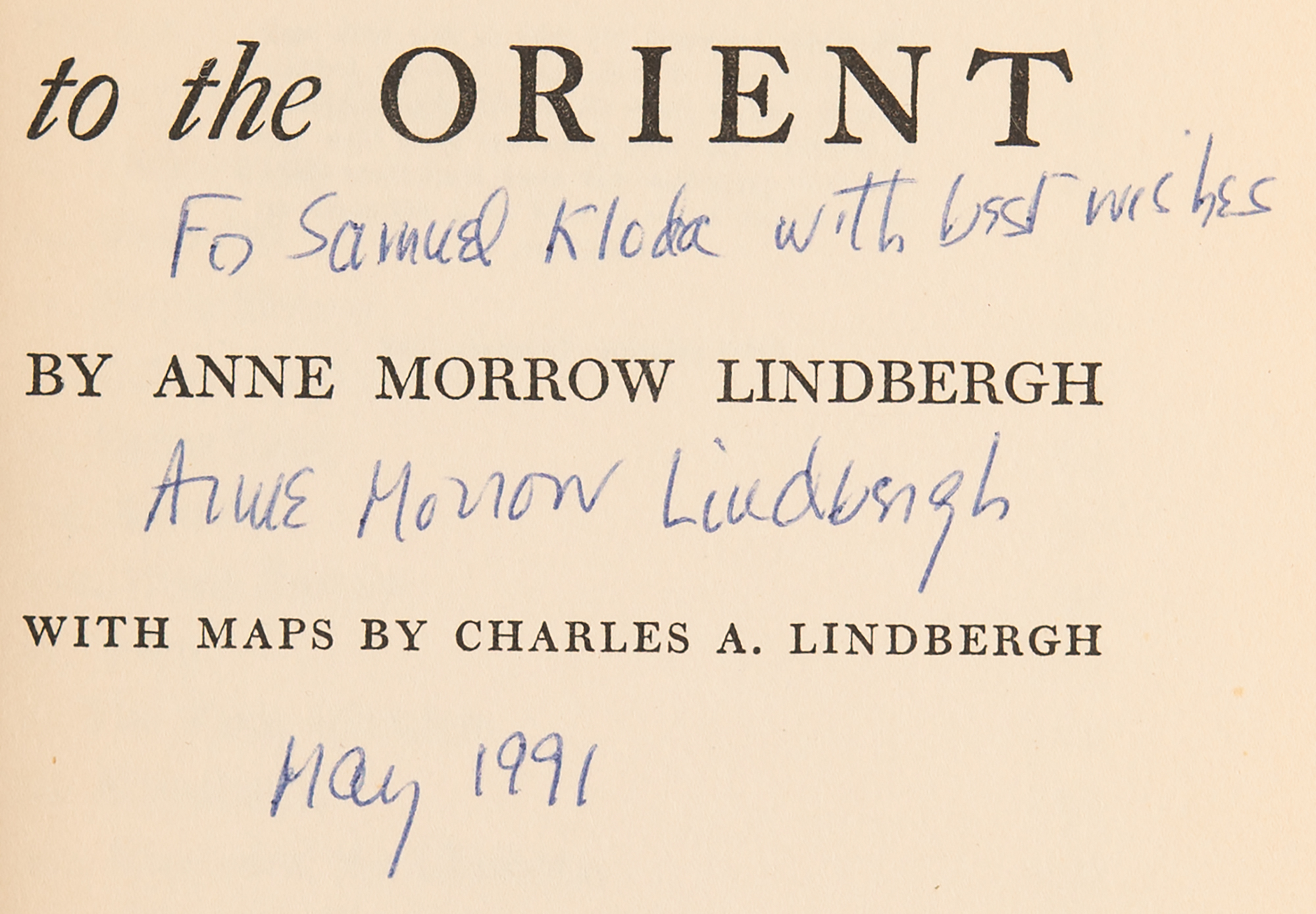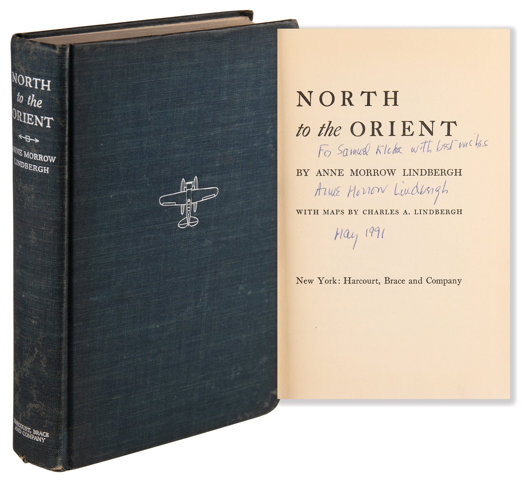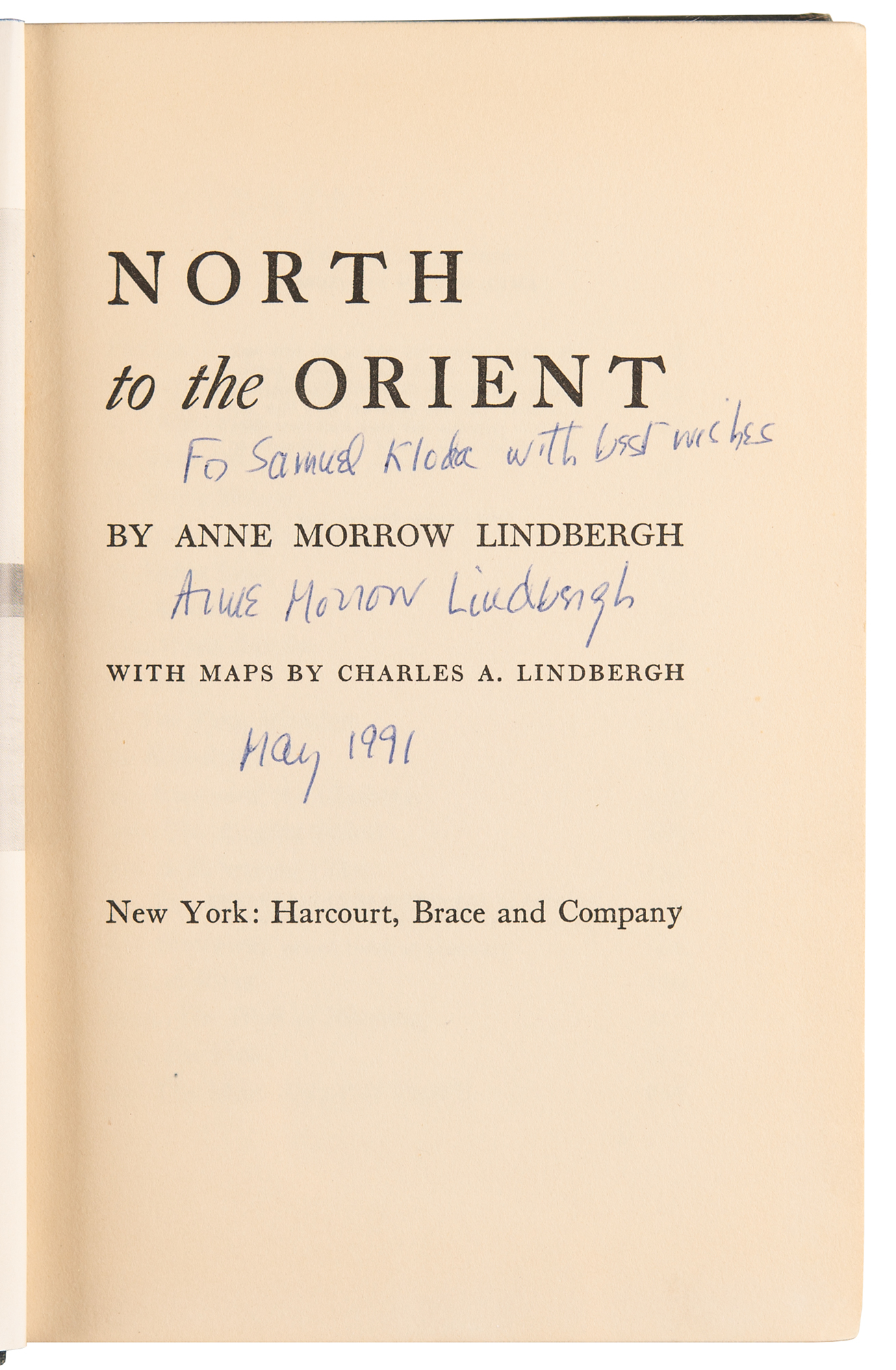 Signed book: North to the Orient. Fifth printing. NY: Harcourt, Brace and Company, 1935. Hardcover, 5.75 x 8.25, 255 pages. Signed and inscribed on the title page in ballpoint, "For Samuel Kloda, with best wishes, Anne Morrow Lindbergh, May 1991." In fine condition, with light staining to the pastedowns, and light cover wear.