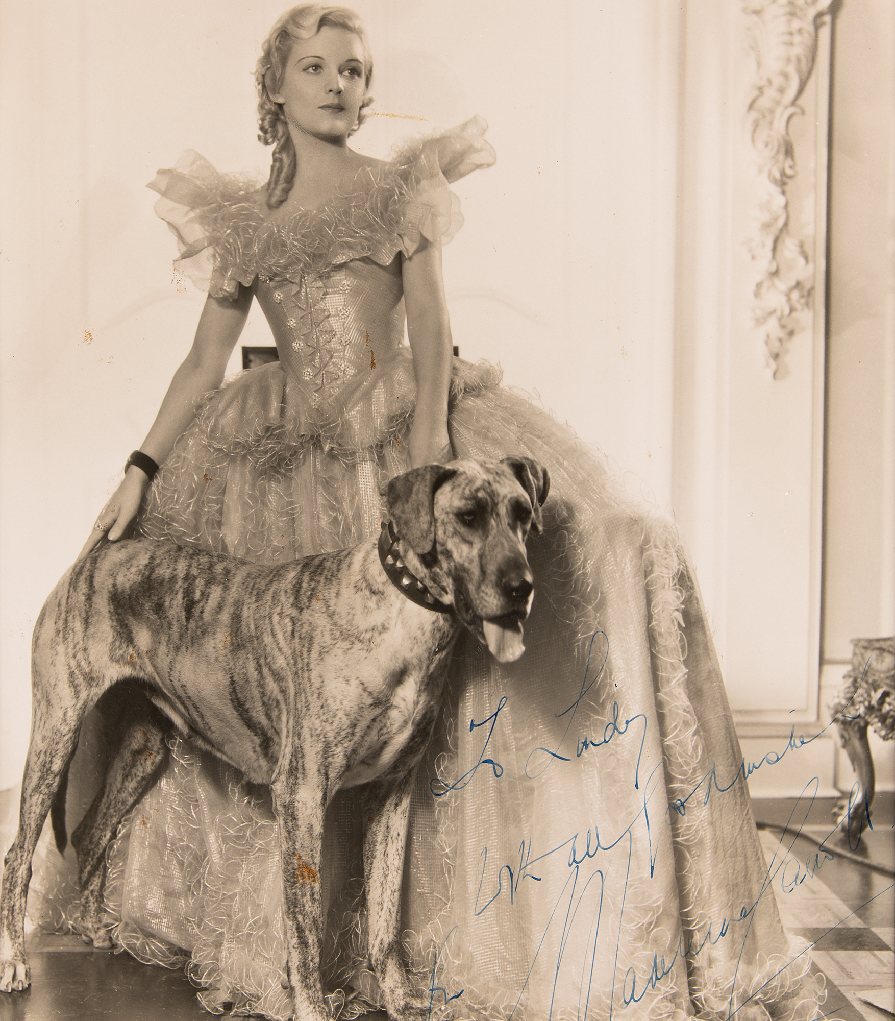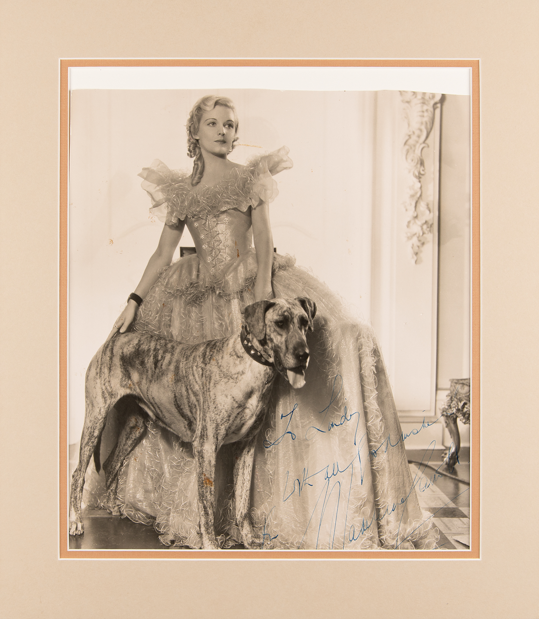 Vintage semi-glossy 11.5 x 14 photo of Madeleine Carroll in an ostentatious gown, posing with a massive Great Dane, signed and inscribed in fountain pen, "To Lindy, With all good wishes, from Madeleine Carroll.” Nicely double-matted to an overall size of 15.5 x 18. In very good to fine condition, with light scuffing, and some small surface dings.