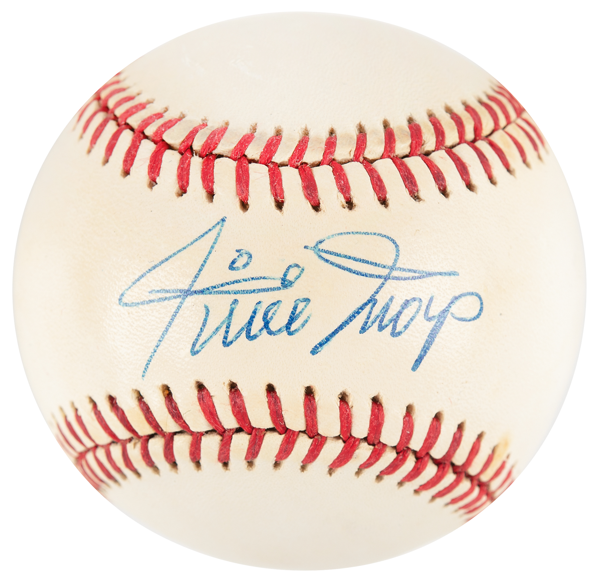 Official Rawlings National League (Feeney) baseball signed in blue ballpoint on the sweet spot by Willie Mays. In fine condition, with some faint toning.