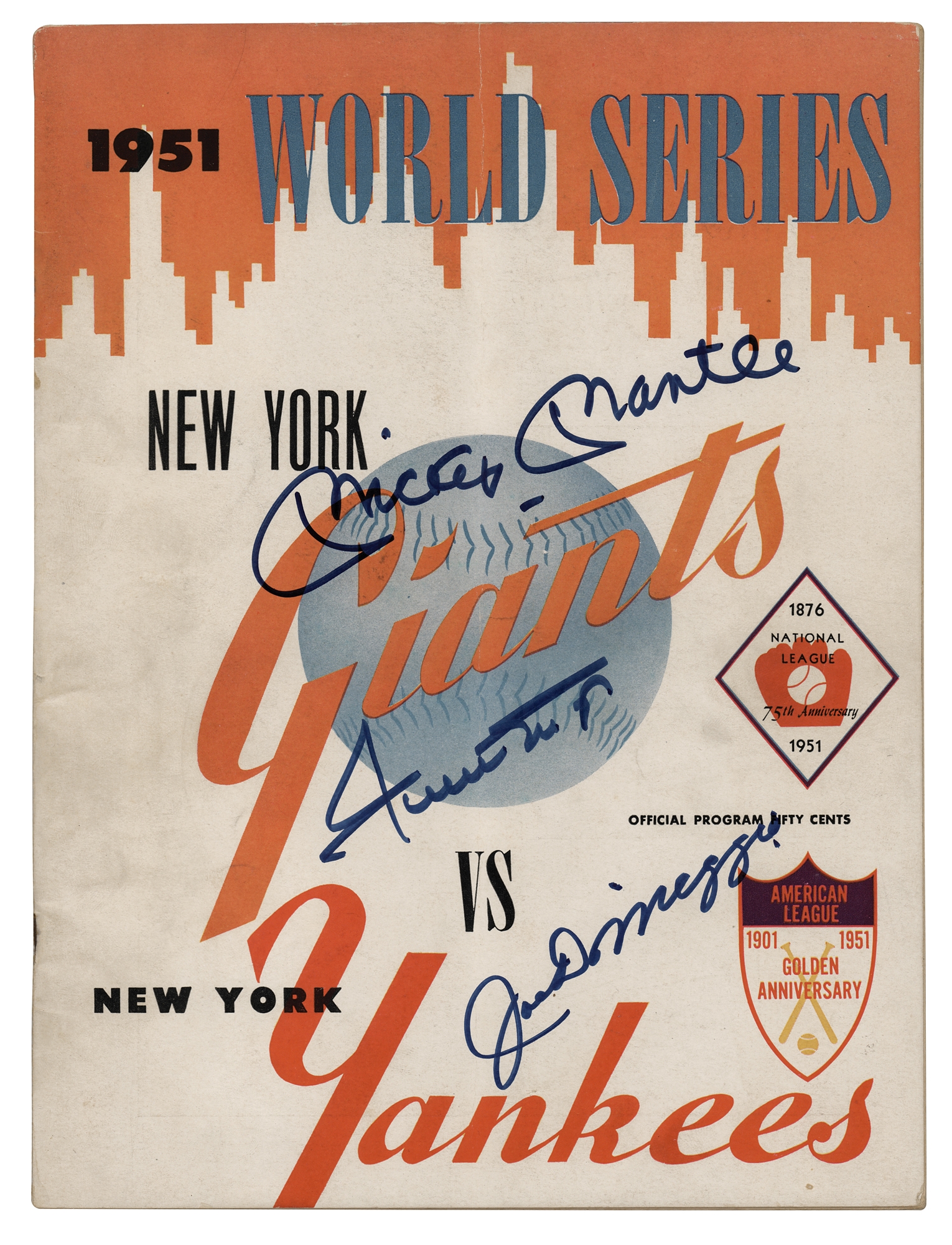 Fantastic original program for the 1951 World Series between the New York Giants and New York Yankees, 8.75 x 11.75, 48 pages, signed on the front cover in blue felt tip by Mickey Mantle, Joe DiMaggio, and Willie Mays. In fine condition, with light handling wear, a faint central vertical fold, and the scorecard inside filled out in pencil.