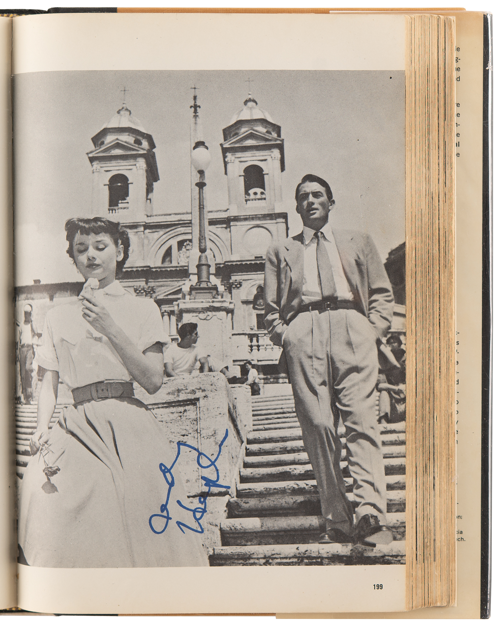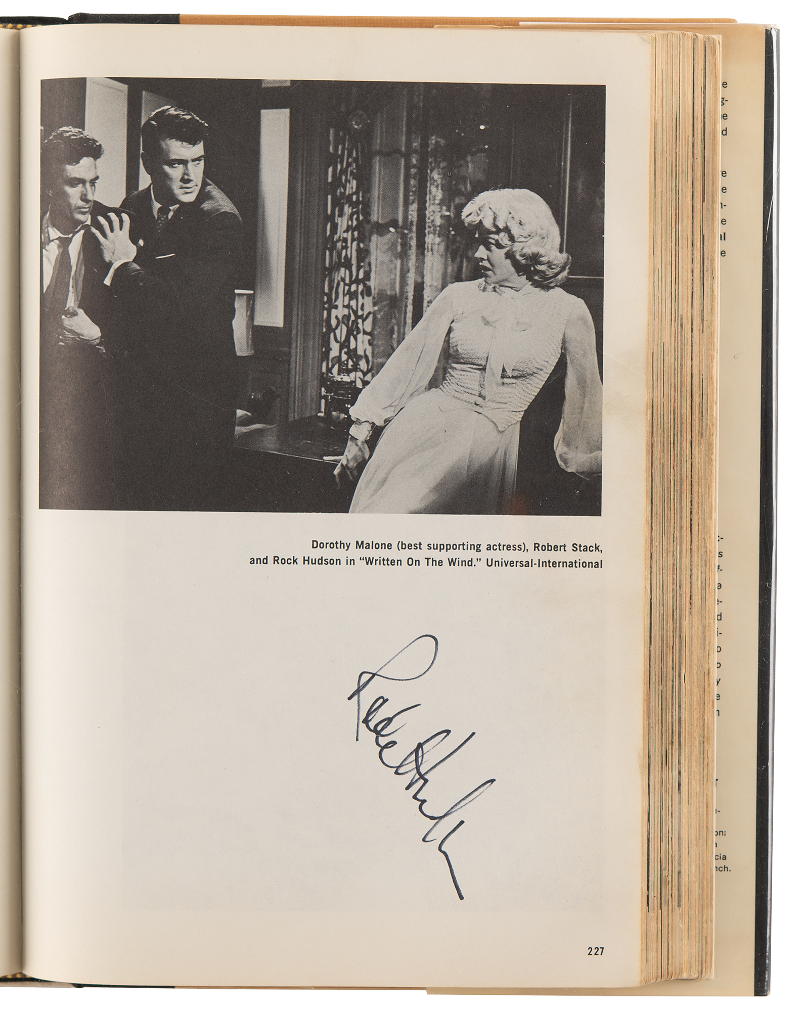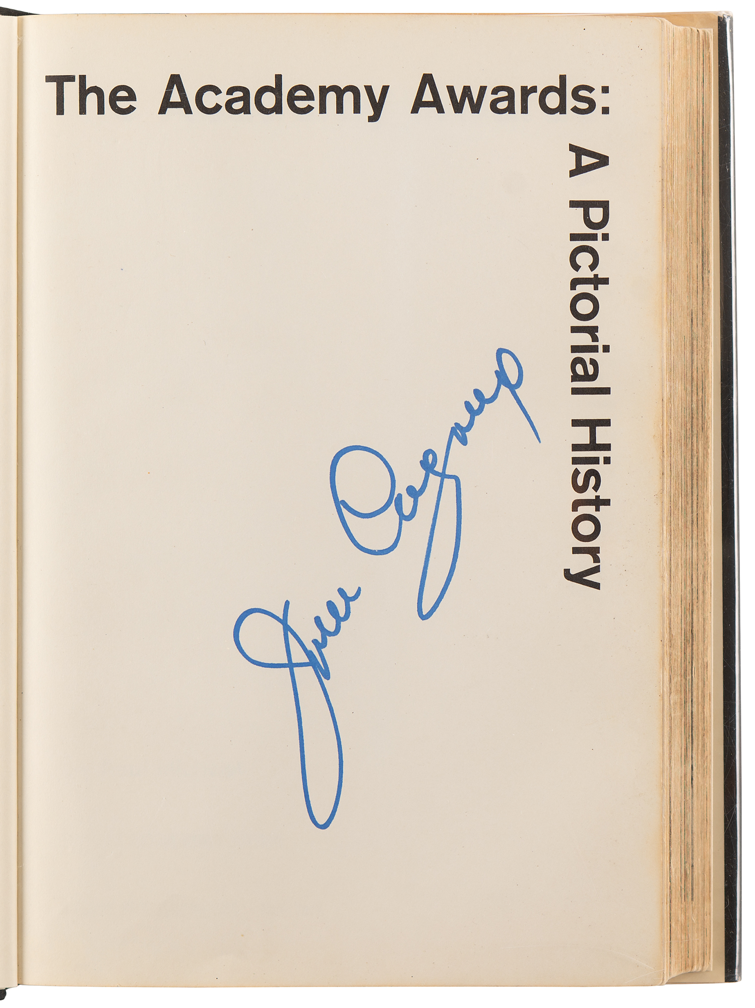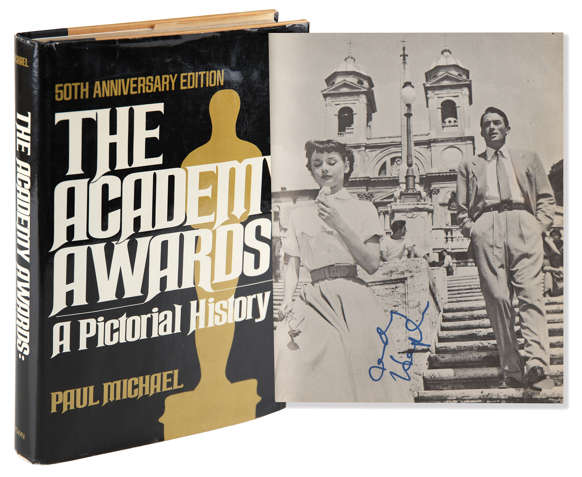 Signed book: The Academy Awards: A Pictorial History by Paul Michael. 50th anniversary edition. NY: Crown Publishers, 1978. Hardcover with dust jacket, 7.5 x 10.25, 406 pages. Signed inside in ink and felt tip by 33 Oscar-winning actors and actresses, a group highlighted by Audrey Hepburn, James Stewart, James Cagney, Jack Lemmon, Sophia Loren, and Rex Harrison. Additionally, the book also contains signatures of actors like Rock Hudson, Douglas Fairbanks, Gale Sondergard, Butterfly McQueen, Myrna Loy, Betty Hutton, and Sylvester Stallone. The remaining Oscar winners are as follows: Janet Gaynor, Helen Hayes, Claudette Colbert, Joan Fontaine, Celeste Holm, Laurence Olivier, Jose Ferrer, Kim Hunter, Jo Van Fleet, Shirley Jones, Sandy Dennis, Walter Matthau, Rod Steiger, George Kennedy, Estelle Parsons, Cliff Robertson, Ruth Gordon, Maggie Smith, Gene Hackman, Liza Minnelli, Joel Gray, Eileen Heckart, John Houseman, Art Carney, Ellen Burstyn, George Burns, and Jason Robards. A handful of actors sign multiple pages, including Stewart, Lemmon, and Matthau, who each sign three times. In fine condition.