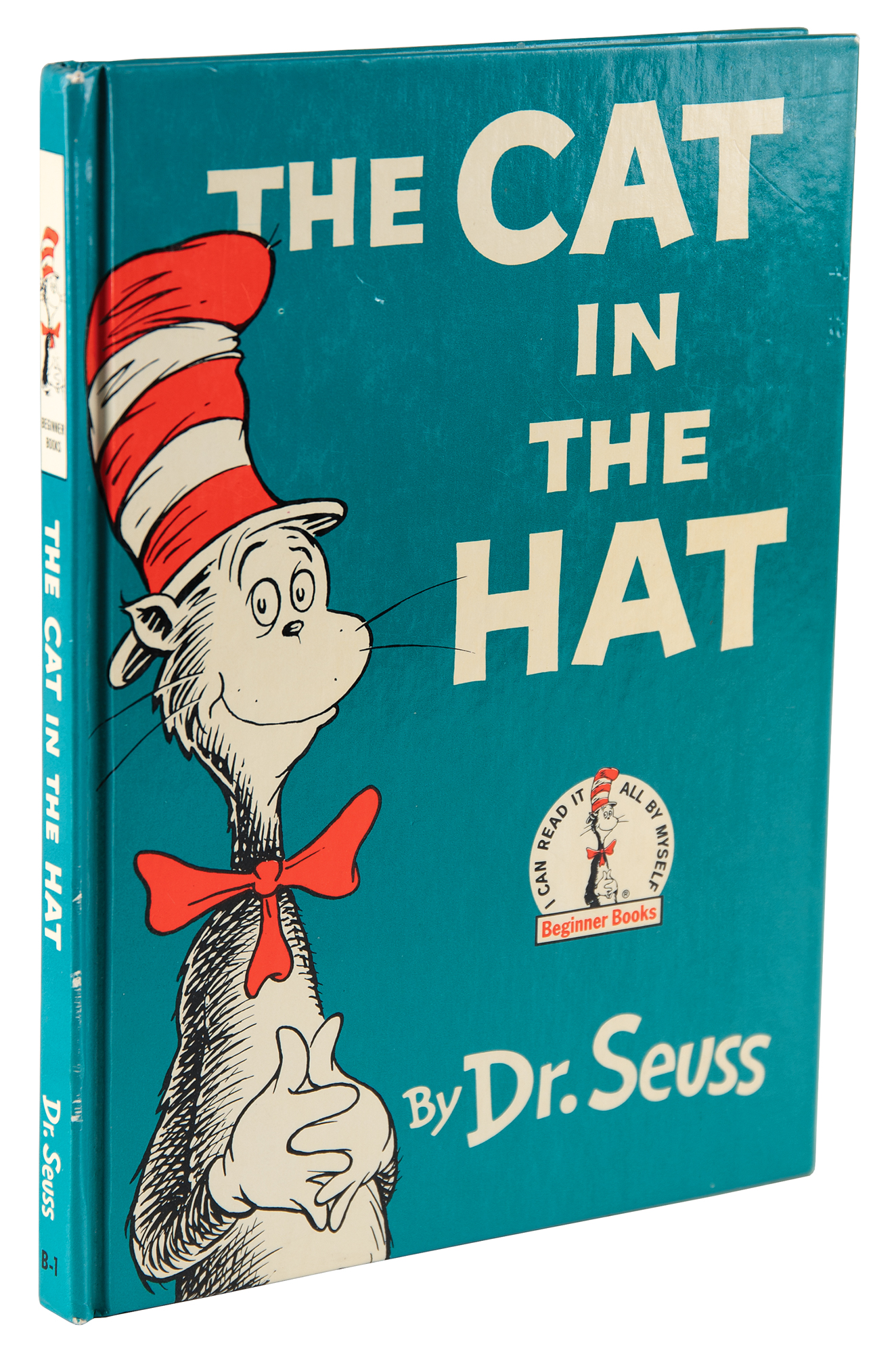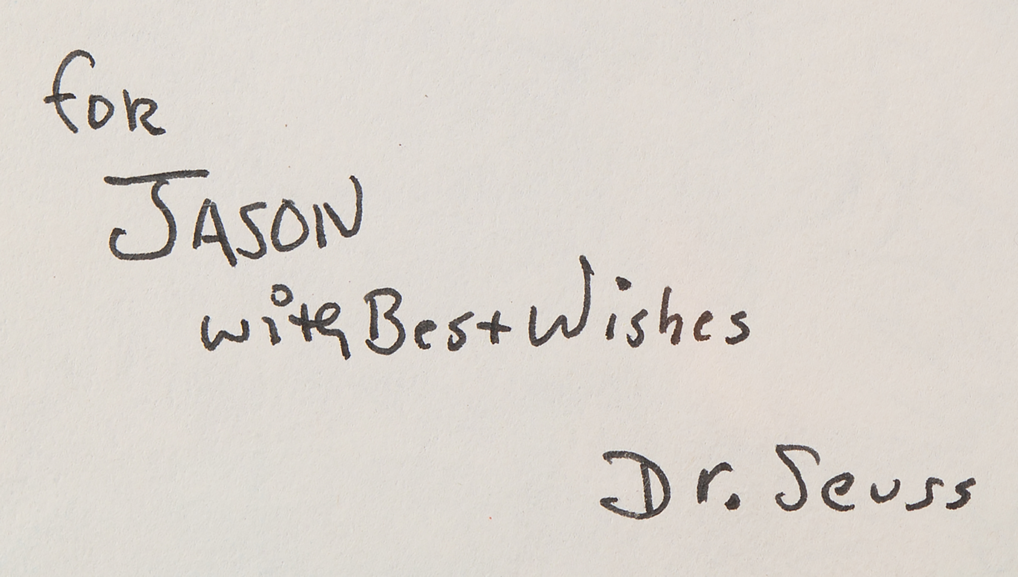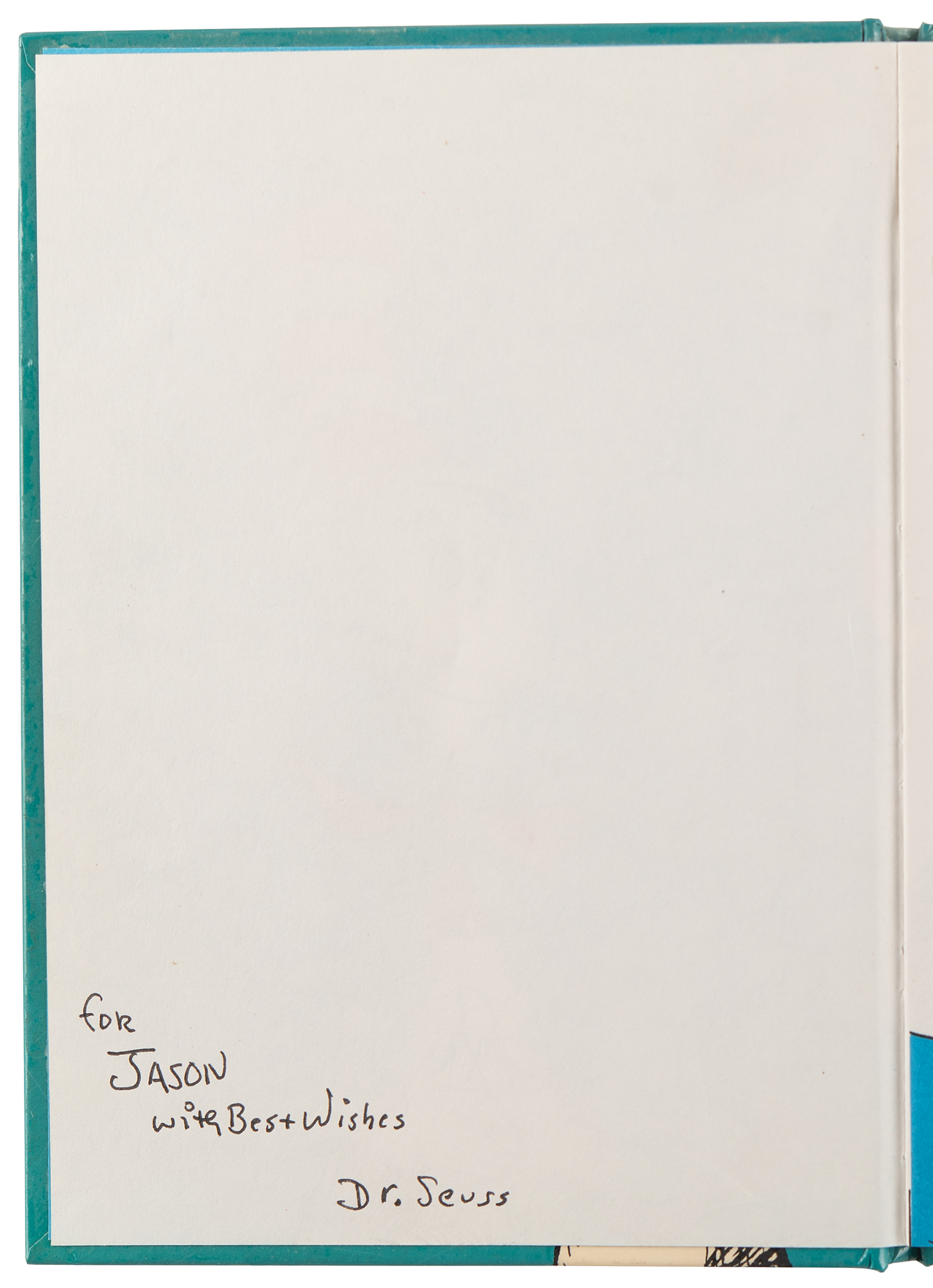 Signed book: The Cat in the Hat. Early 'Beginner Books' printing. NY: Random House, 1957. Pictorial hardcover (missing the dust jacket), 6.75 x 9.25, 61 pages. Signed and inscribed opposite the title page in black felt tip, "For Jason, with best wishes, Dr. Seuss." In fine condition.