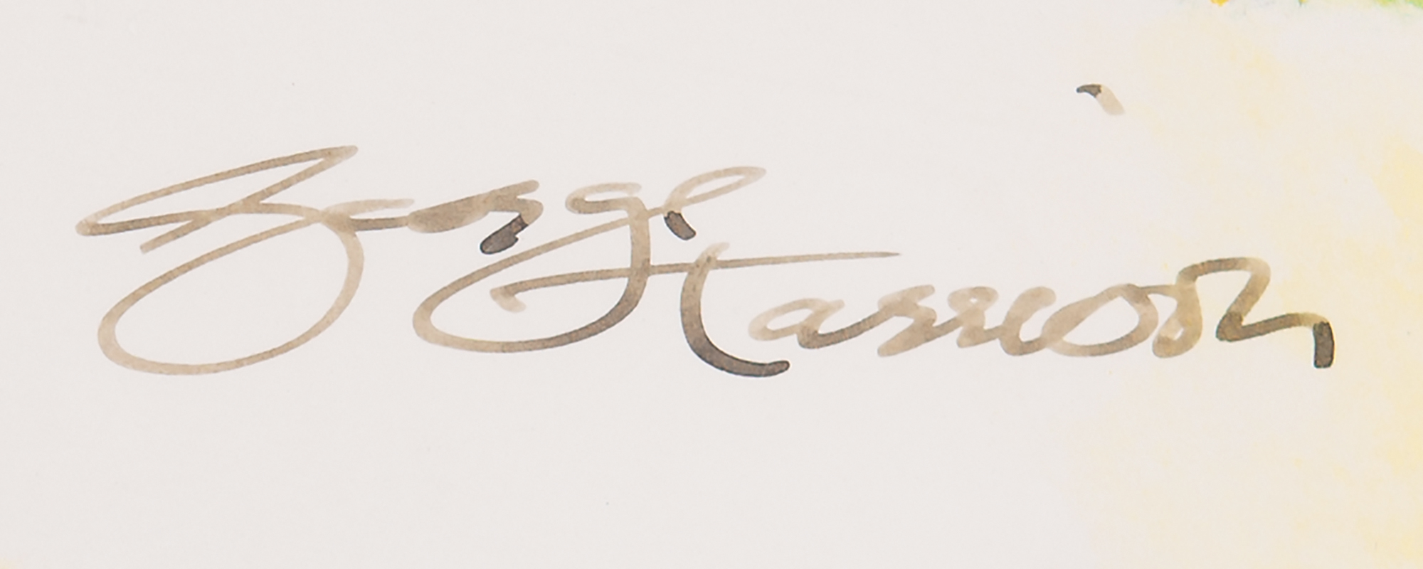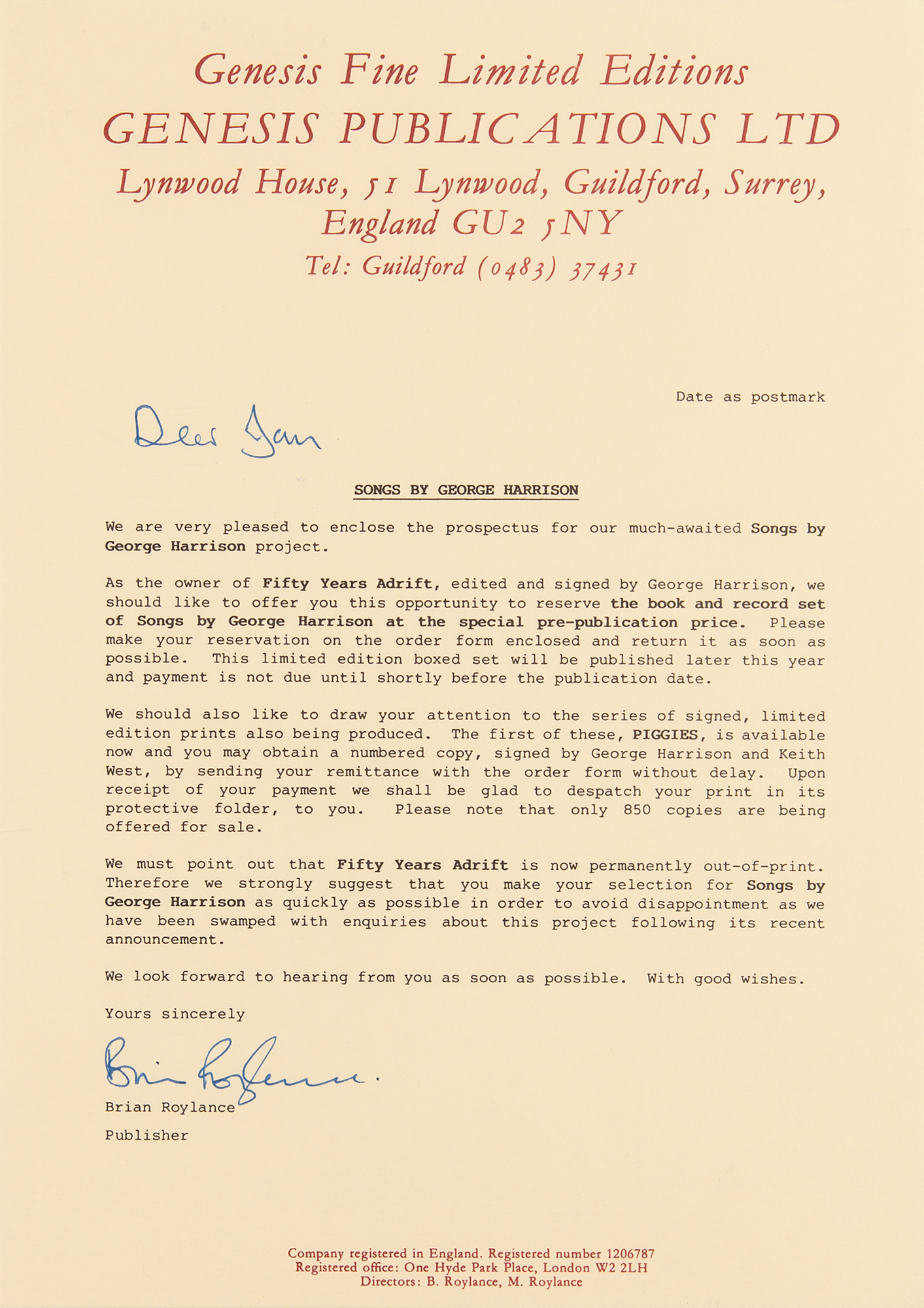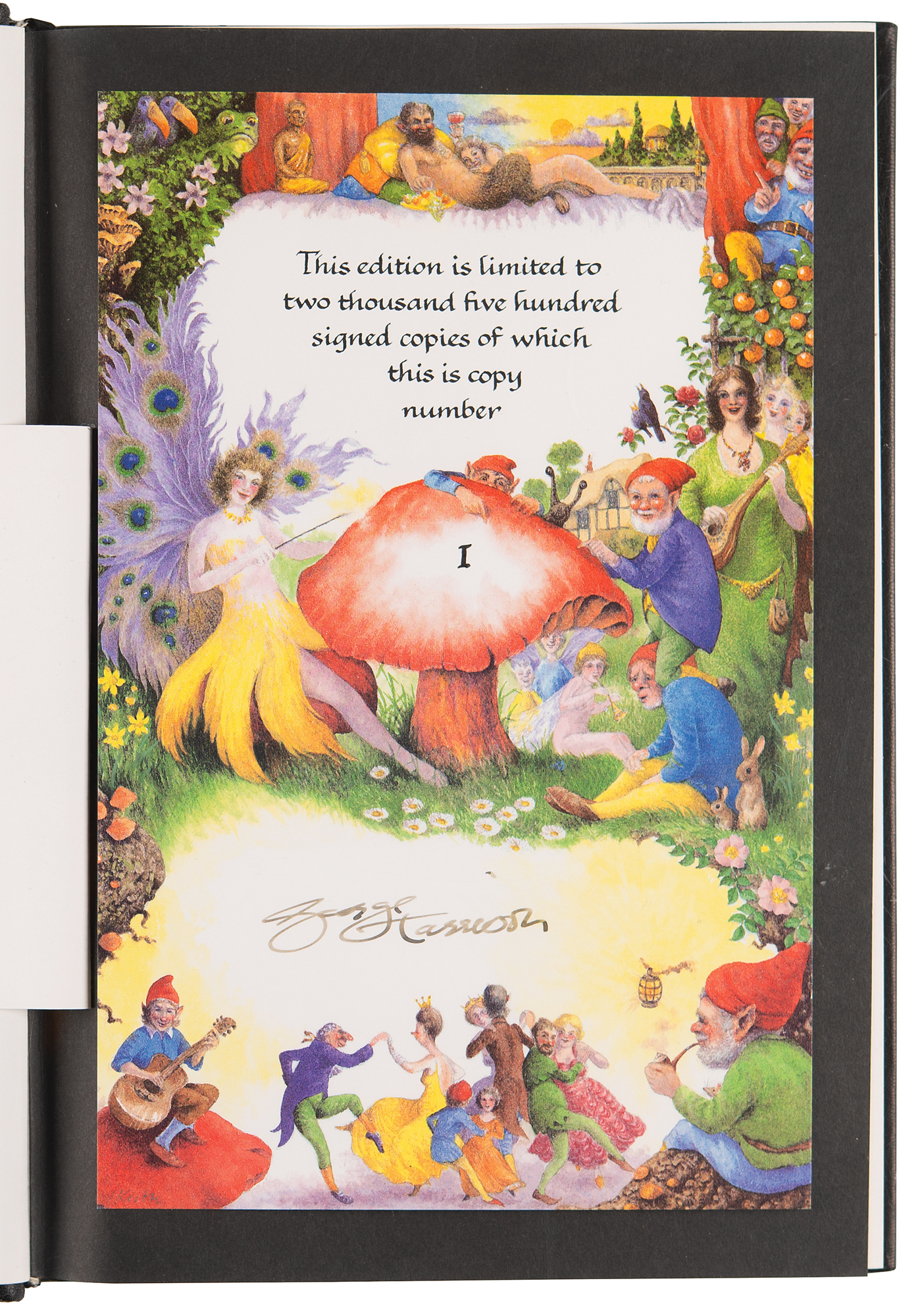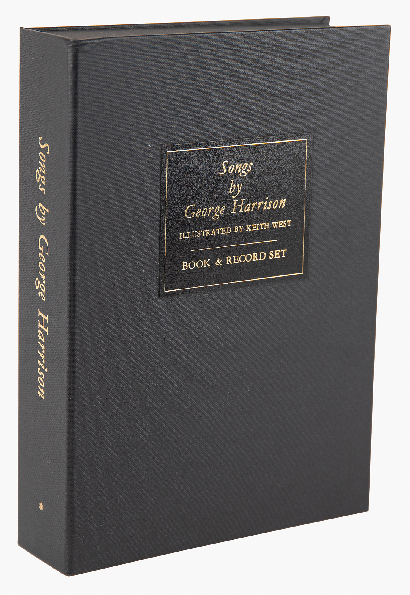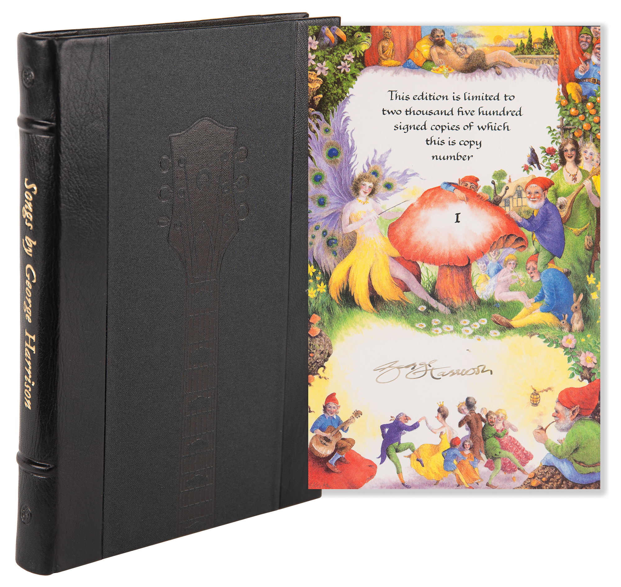 Signed book: Songs by George Harrison: Book and Record Set. Originally produced in a limited edition of 2500, with a laid-in note indicating that this is number I of 250 extra copies prepared for review. Surrey, England: Genesis Publications Limited, 1987. Leatherbound hardcover with clamshell case, 8 x 11, 175 pages. Signed on the colophon in ink, "George Harrison." Also signed on a bookplate affixed to the first free end page by illustrator Keith West. Slipcase includes a limited edition four-song CD with the tracks ‘Sat Singing,’ ‘Lay His Head,’ ‘For You Blue,’ and ‘Flying Hour.’ In very fine condition. Accompanied by the publisher's prospectus and order form. A gorgeous, first-in-series example of this deluxe limited edition signed book—an essential volume for any music lover's library.