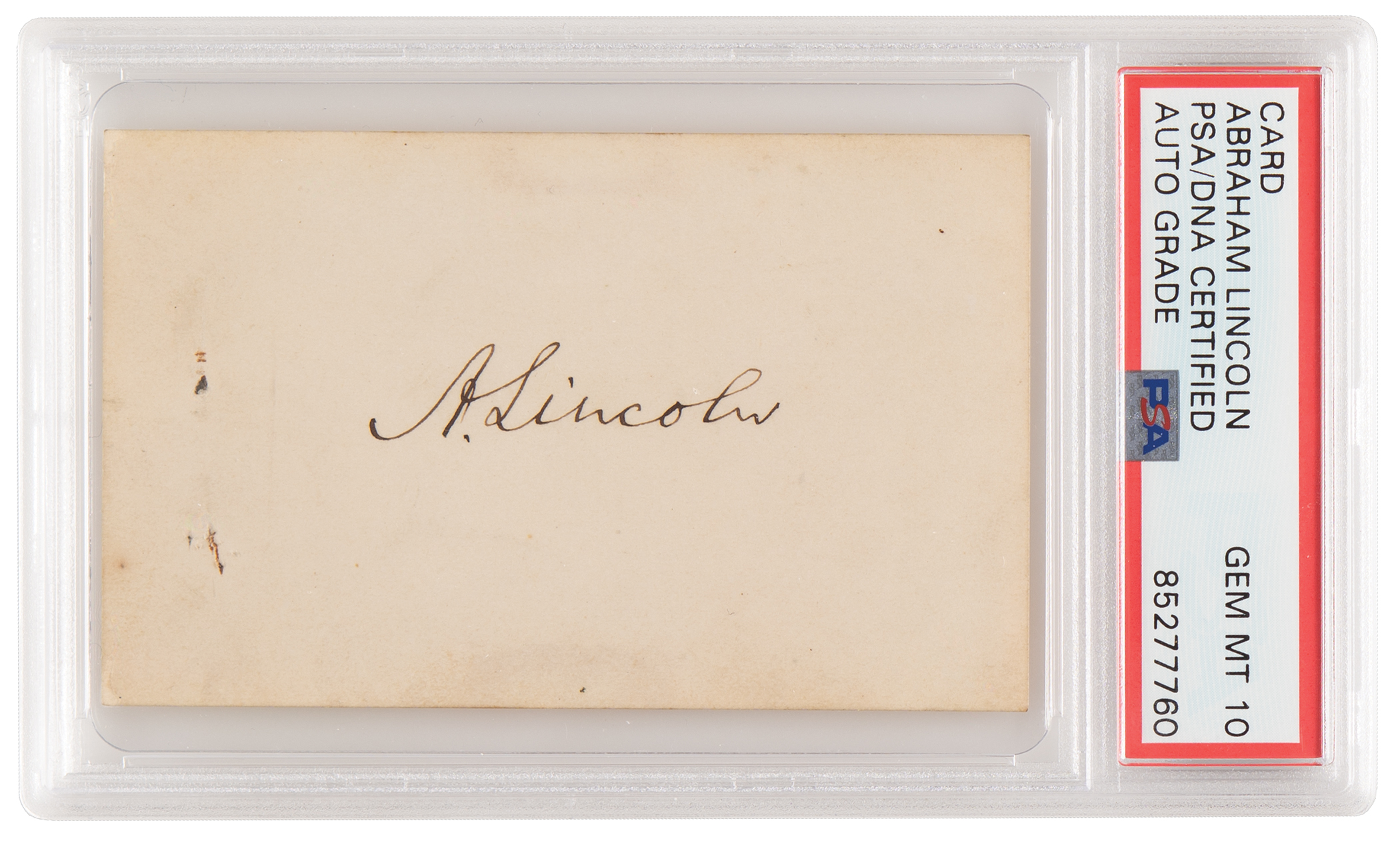 Ink signature of President Abraham Lincoln, "A. Lincoln,? on an off-white 3.5 x 2.25 card. In fine condition, with a couple of trivial stains to the left edge. Encapsulated and graded by PSA/DNA as "GEM MT 10."