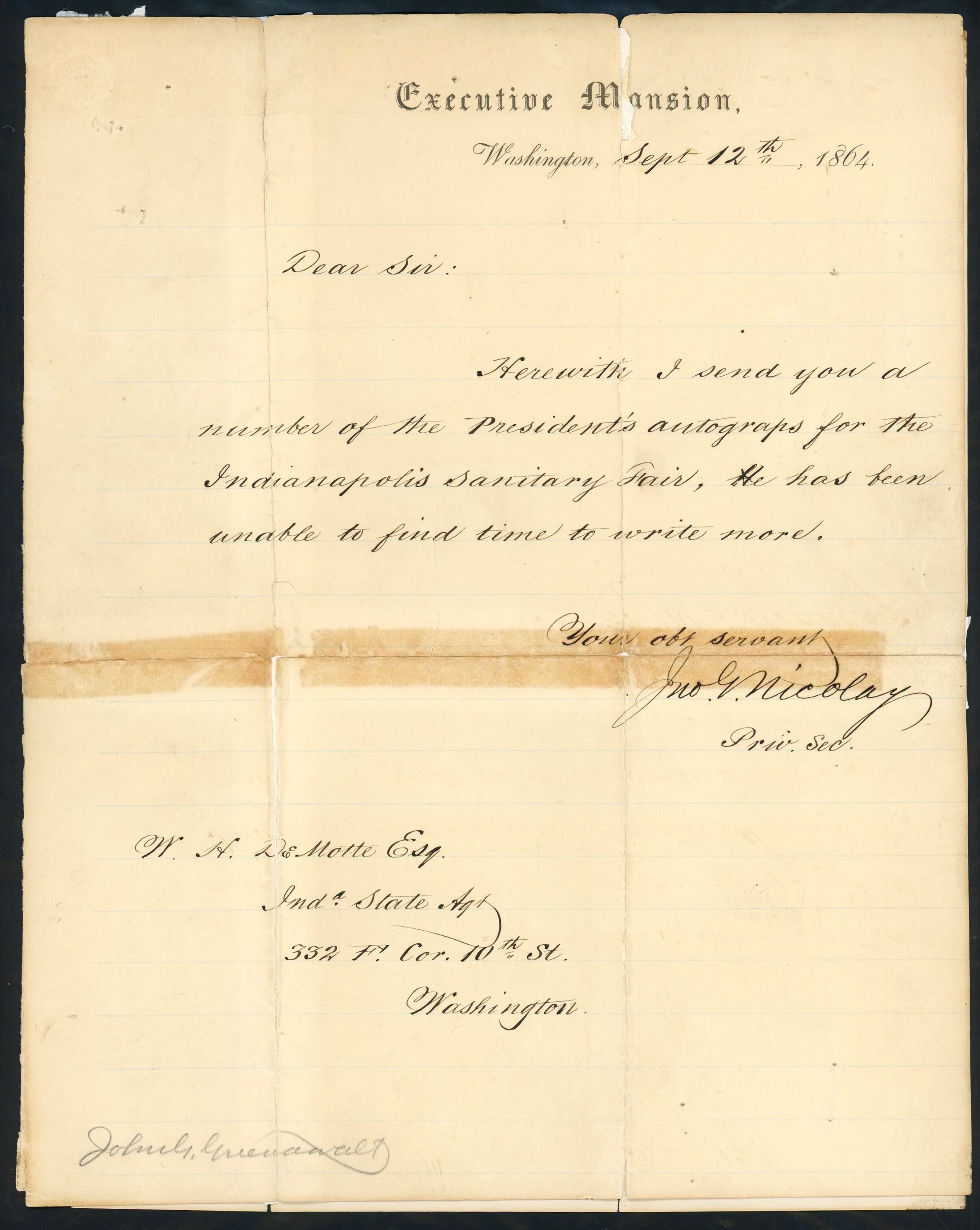 Accompanied by a copy of the original Civil War-dated Executive Mansion letter from President LIncoln?s private secretary, John George Nicolay, sent to W. H. DeMotte on September 12, 1864, which reads: ?Herewith I send you a number of the President?s autographs for the Indianapolis Sanitary Fair. He has been unable to find time to write more.?