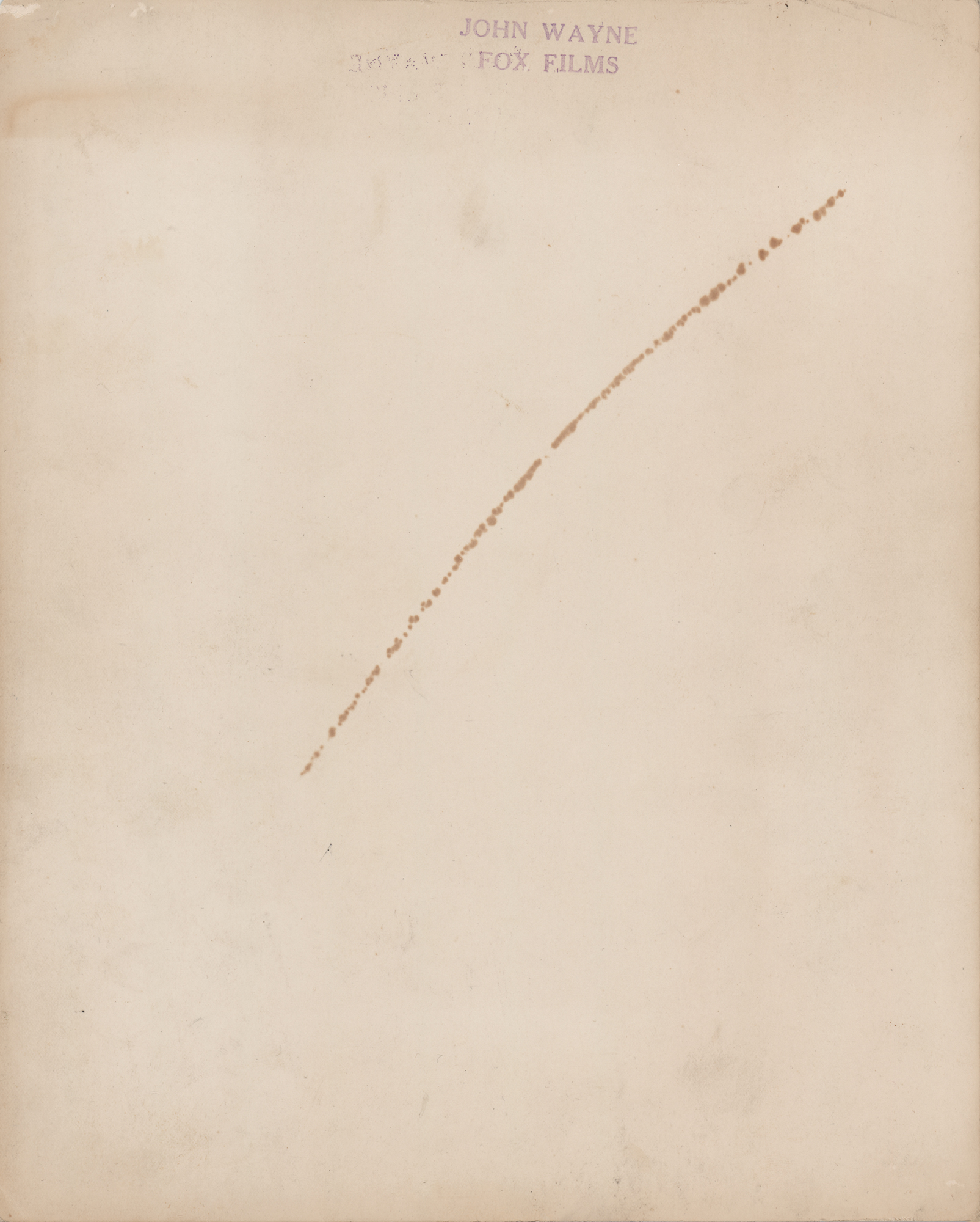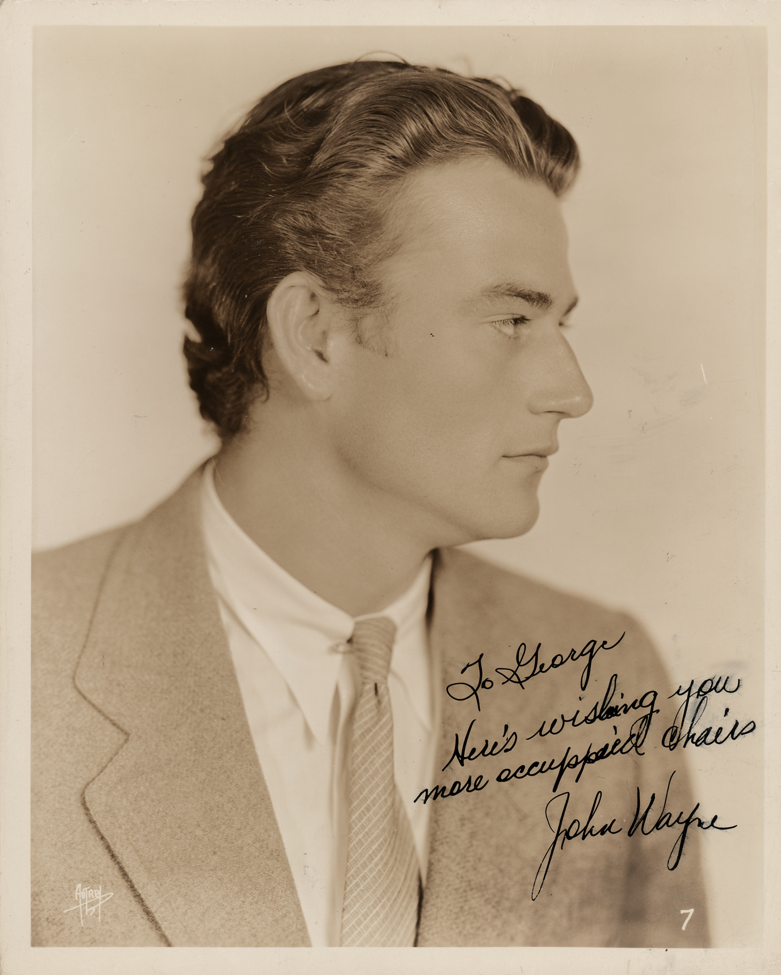 Superb vintage sepia glossy 8 x 10 profile photo of a young John Wayne by Autrey of Hollywood, signed and inscribed in bold black ink, "To George, Here's wishing you more occuppied [sic] chairs, John Wayne.” The reverse bears a “John Wayne, Fox Films” stamp. In fine condition, with a chipped upper right corner tip. A handsome and stunningly early portrait of the future Hollywood legend, pictured here as a burgeoning bit player as part of the Fox Films roster.