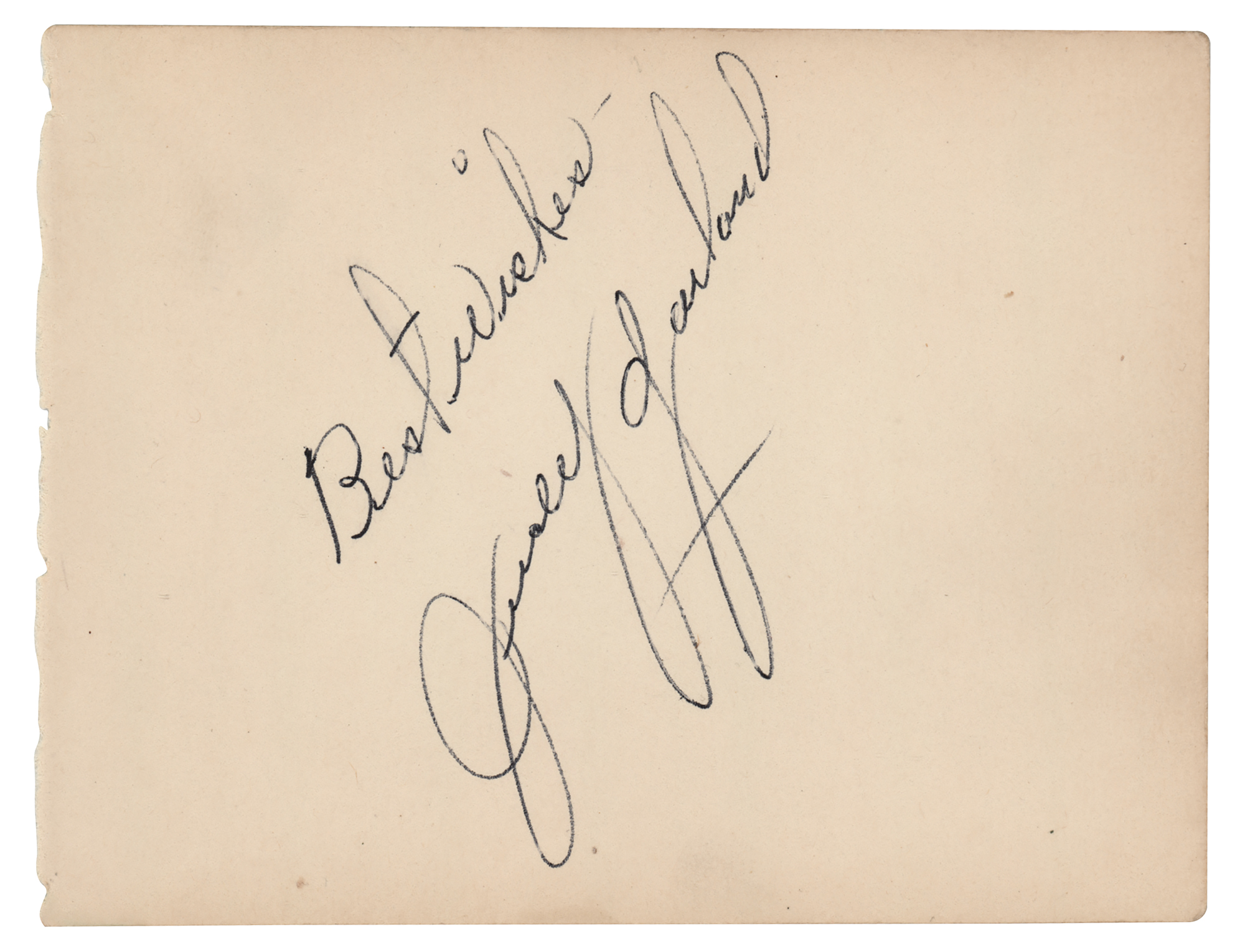 Attractive vintage ballpoint signature, "Best wishes, Judy Garland,” on an off-white 5.5 x 4.25 album page. In fine condition.