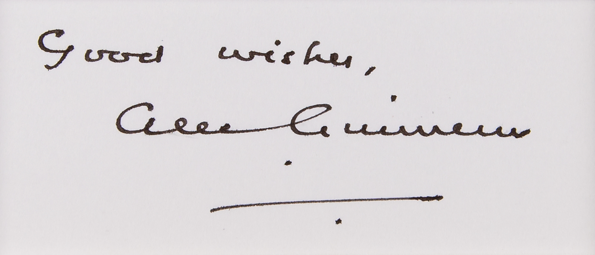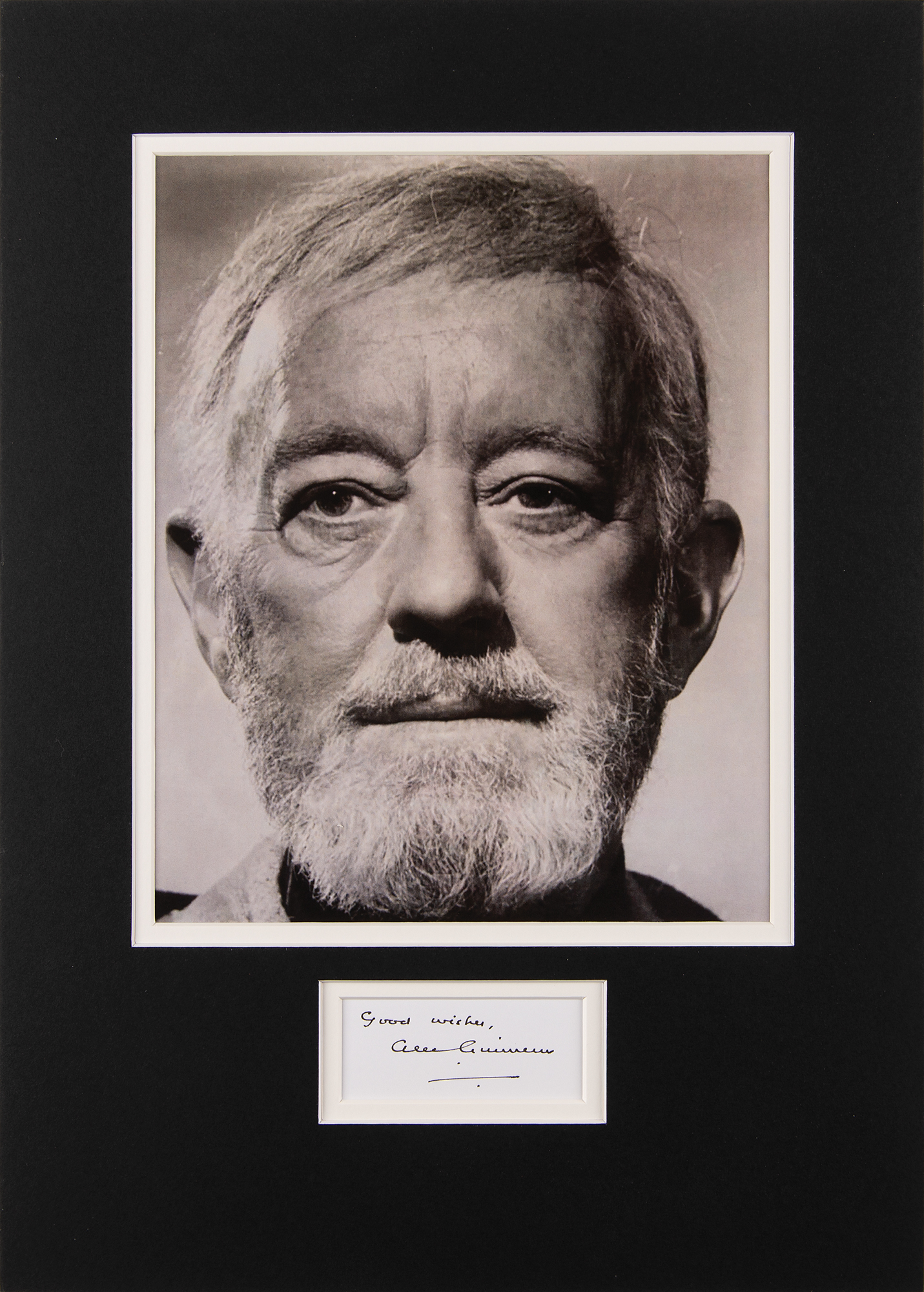 Ink signature, "Good wishes, Alec Guinness,” on a white 3 x 1.25 sheet, which is double-matted with a large photo of Guinness as Jedi Master Obi-Wan Kenobi from Star Wars to an overall size of 11.75 x 16.5. In very fine condition.