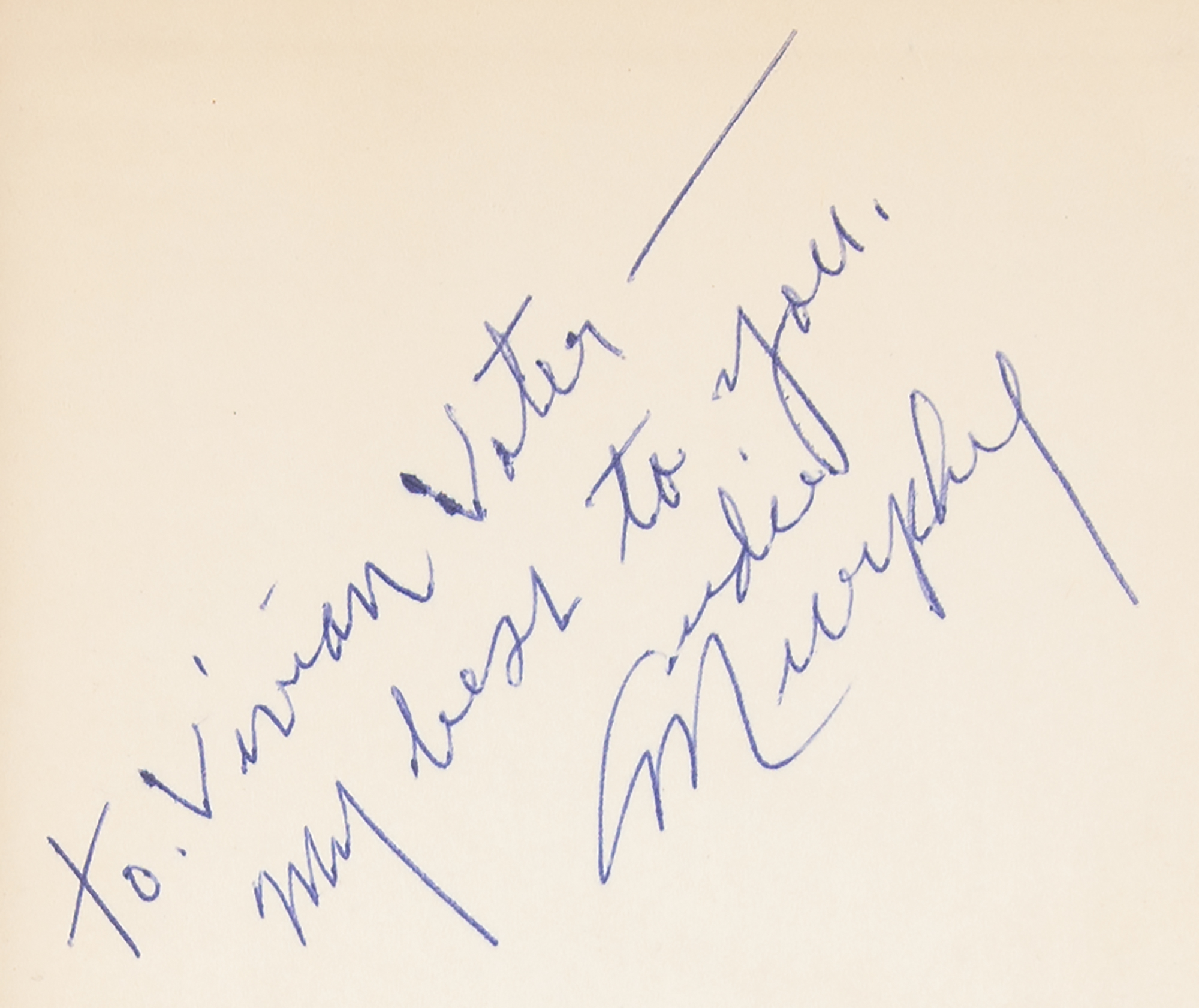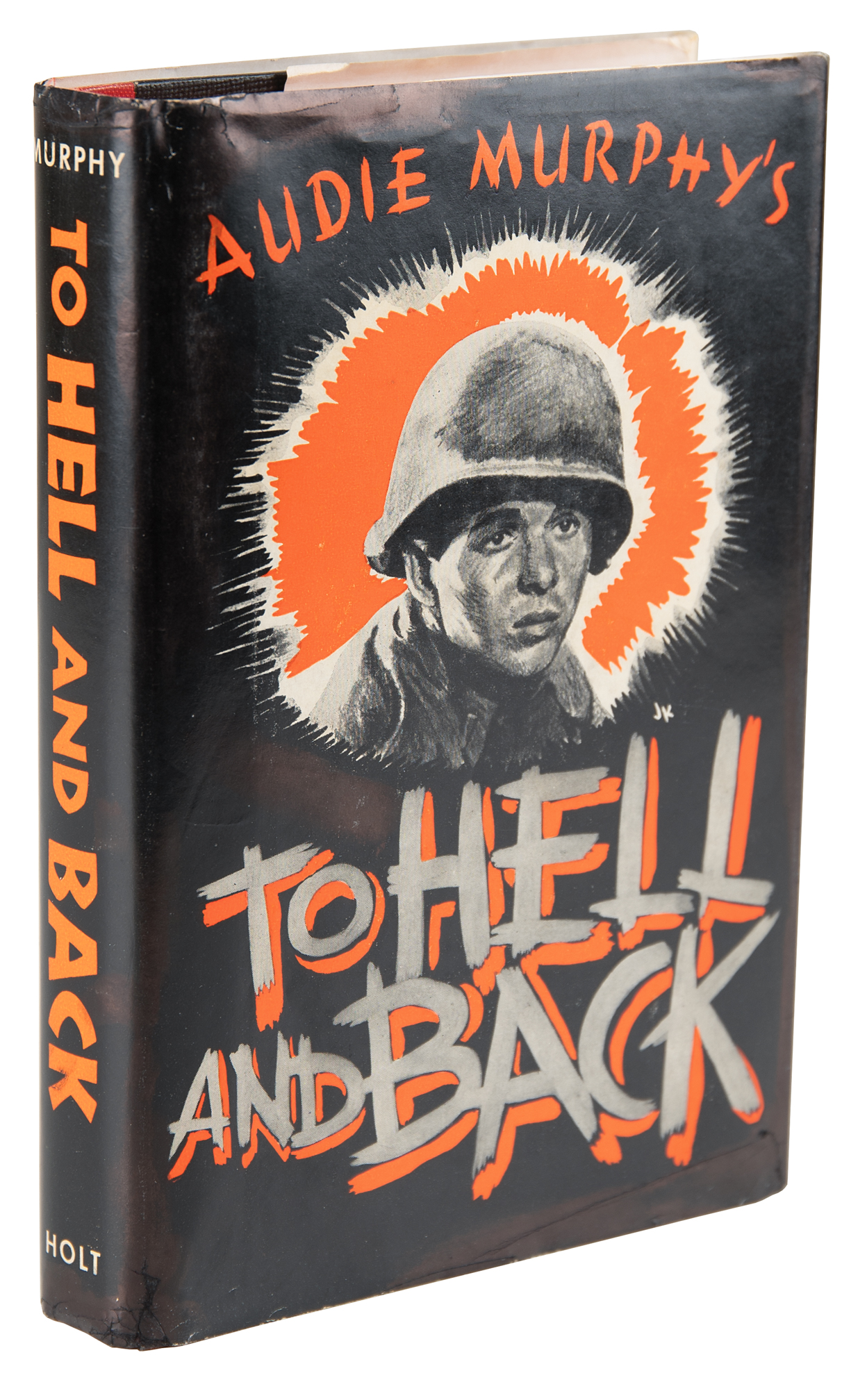 Signed book: To Hell and Back. First edition, first printing. NY: Henry Holt and Company, 1949. Hardcover with dust jacket, 5.5 x 8.25, 274 pages. Signed and inscribed on the first free end page in blue ballpoint, “To Vivian Voter – my best to you, Audie Murphy." In fine condition.