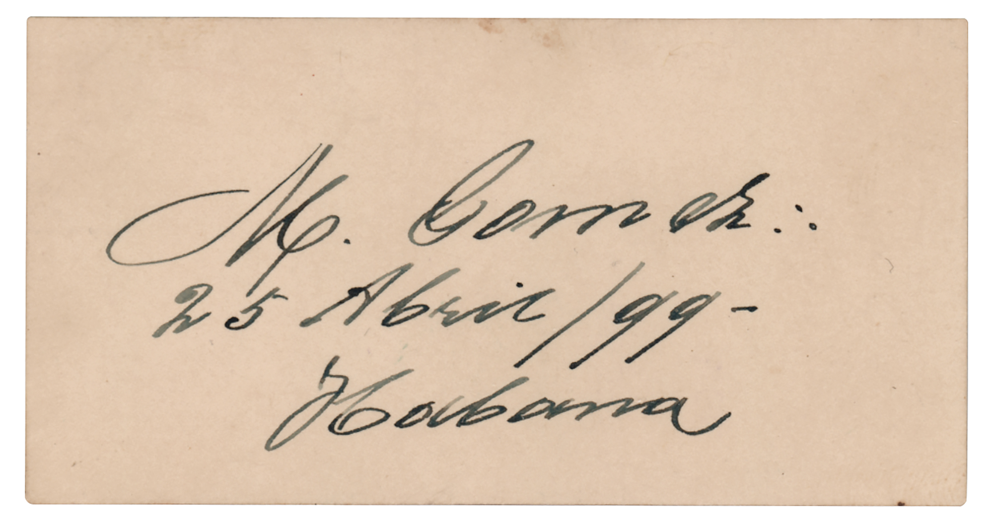 Cuban-Dominican military leader (1836–1905) who led the revolutionary forces during the Cuban War of Independence, known for executing a brutal scorched-earth policy against Spanish troops and loyalists. Choice ink signature, "M. Gomez, 25 Abril/99, Habana,” on an off-white 3.25 x 1.5 card. In very fine condition.