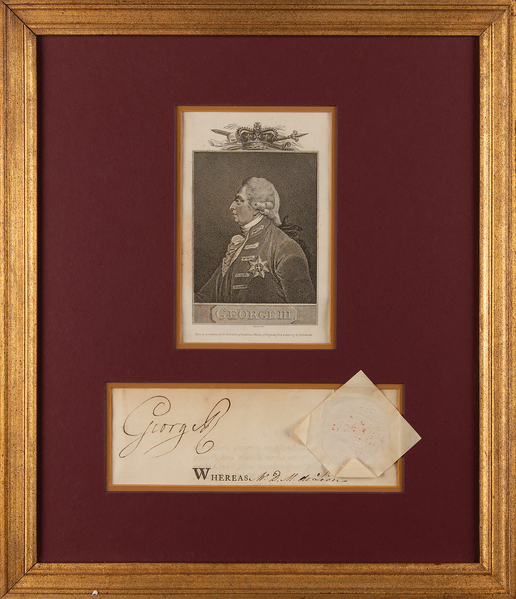 Large and bold ink signature, "George R,” on an off-white 7.75 x 2.5 slip clipped from the head of a document, retaining the paper seal affixed on the right side. Attractively double-matted and framed with an engraved portrait to an overall size of 13.5 x 16. In fine condition.