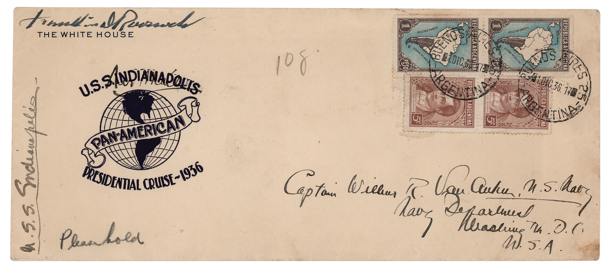 Fantastic commemorative cover with a cachet honoring 1936 pan-American presidential cruise aboard the USS Indianapolis, signed in the upper left in fountain pen by President Franklin D. Roosevelt. Postmarked at Buenos Aires in December 1936. In fine condition.