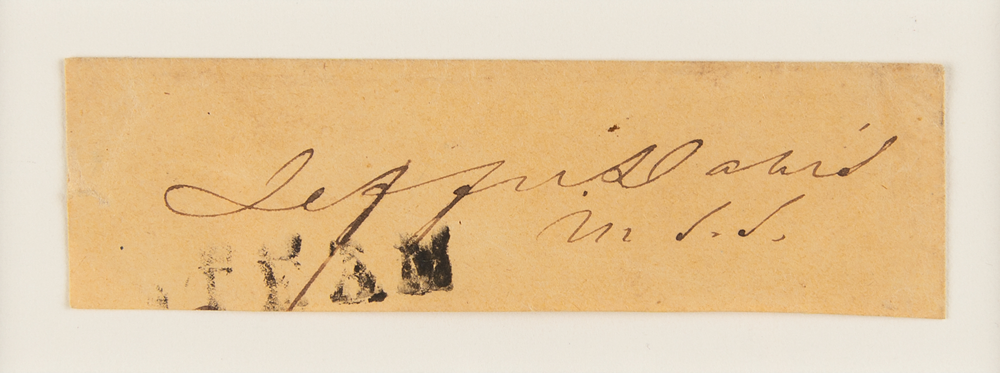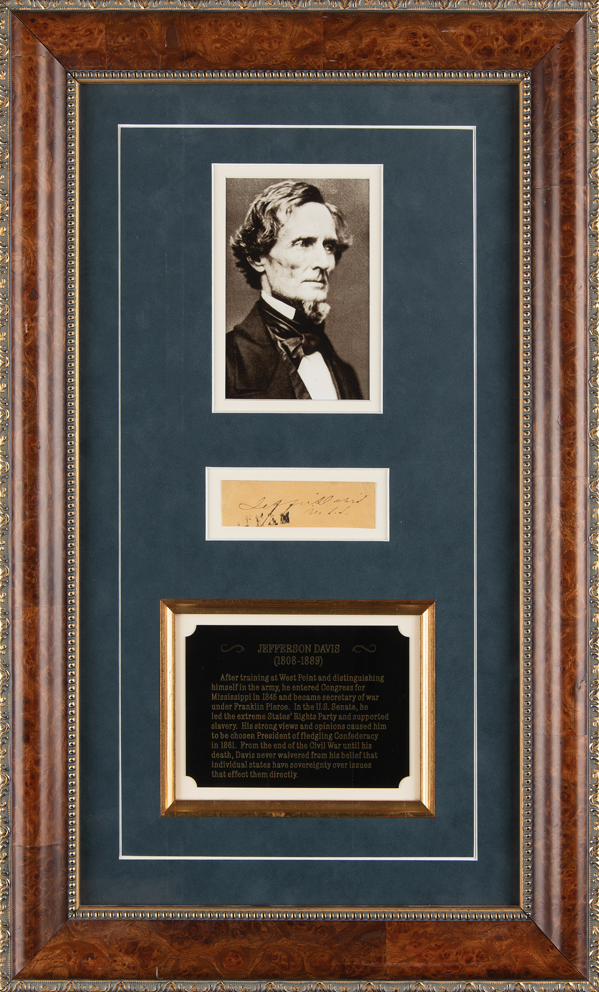 Ink signature, "Jeffer. Davis, U.S.S.," on a beige 3.5 x 1 slip clipped from a free frank. Mounted, matted, and framed with a portrait and plaque to an overall size of 13.25 x 21. In fine condition, with light creasing.