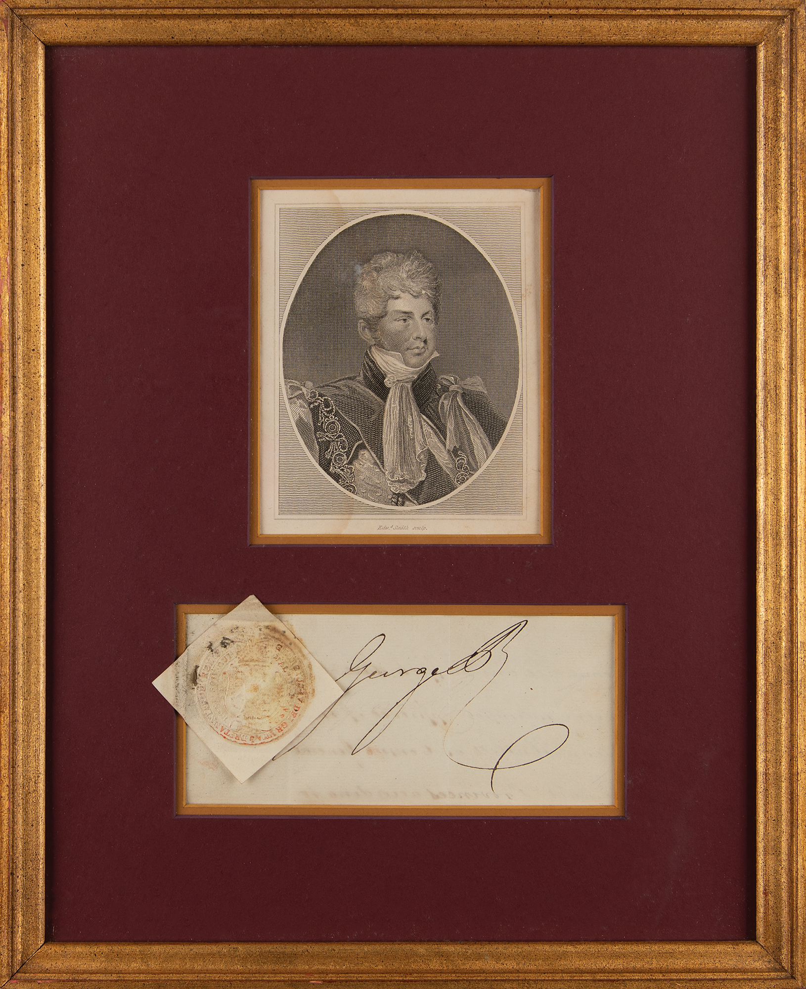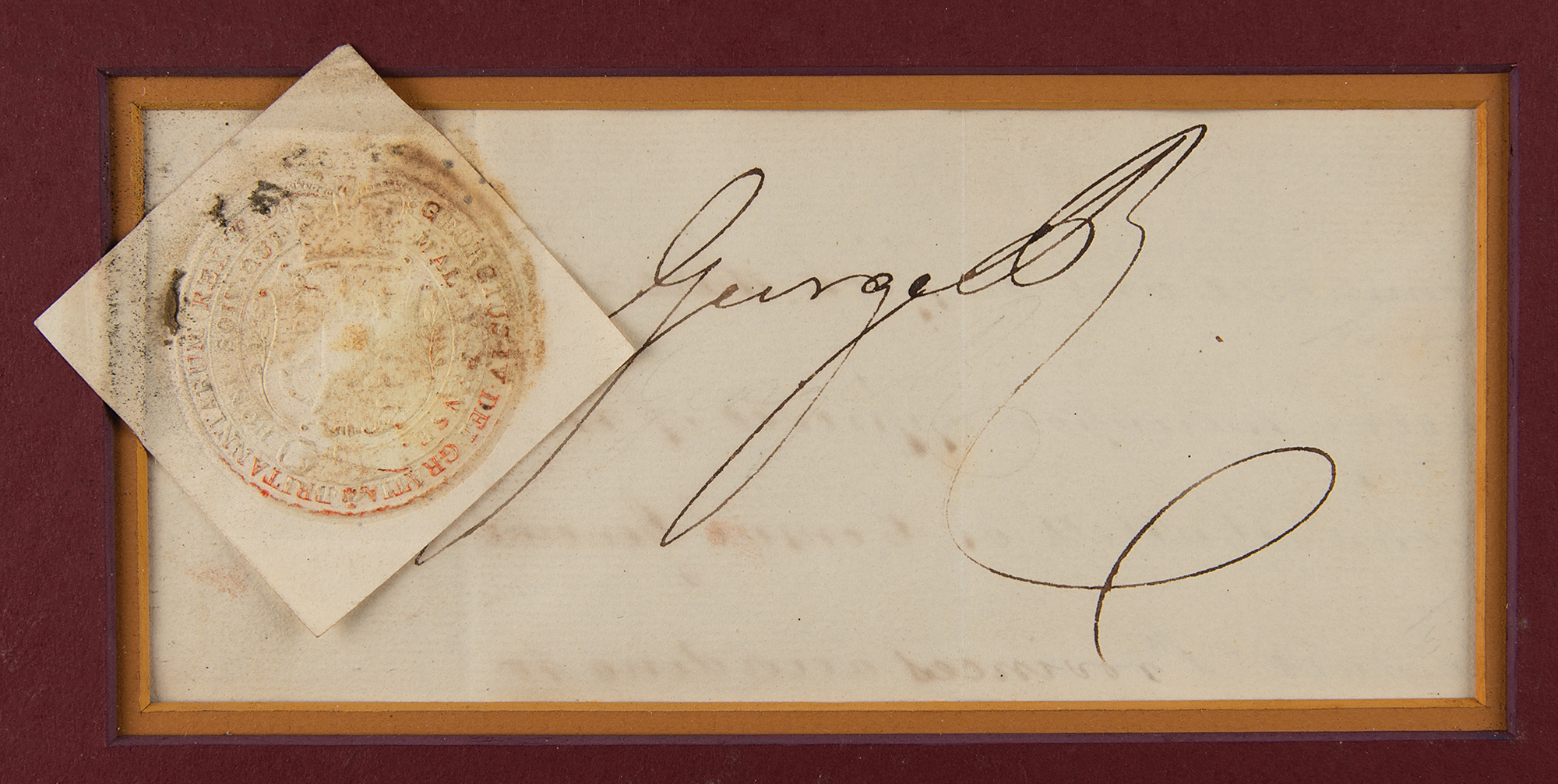 Ink signature, "George R,” on an off-white 6.5 x 3 slip clipped from the head of a document, retaining the paper seal affixed on the left. Attractively double-matted and framed with an engraved portrait to an overall size of 12 x 15. In fine condition.