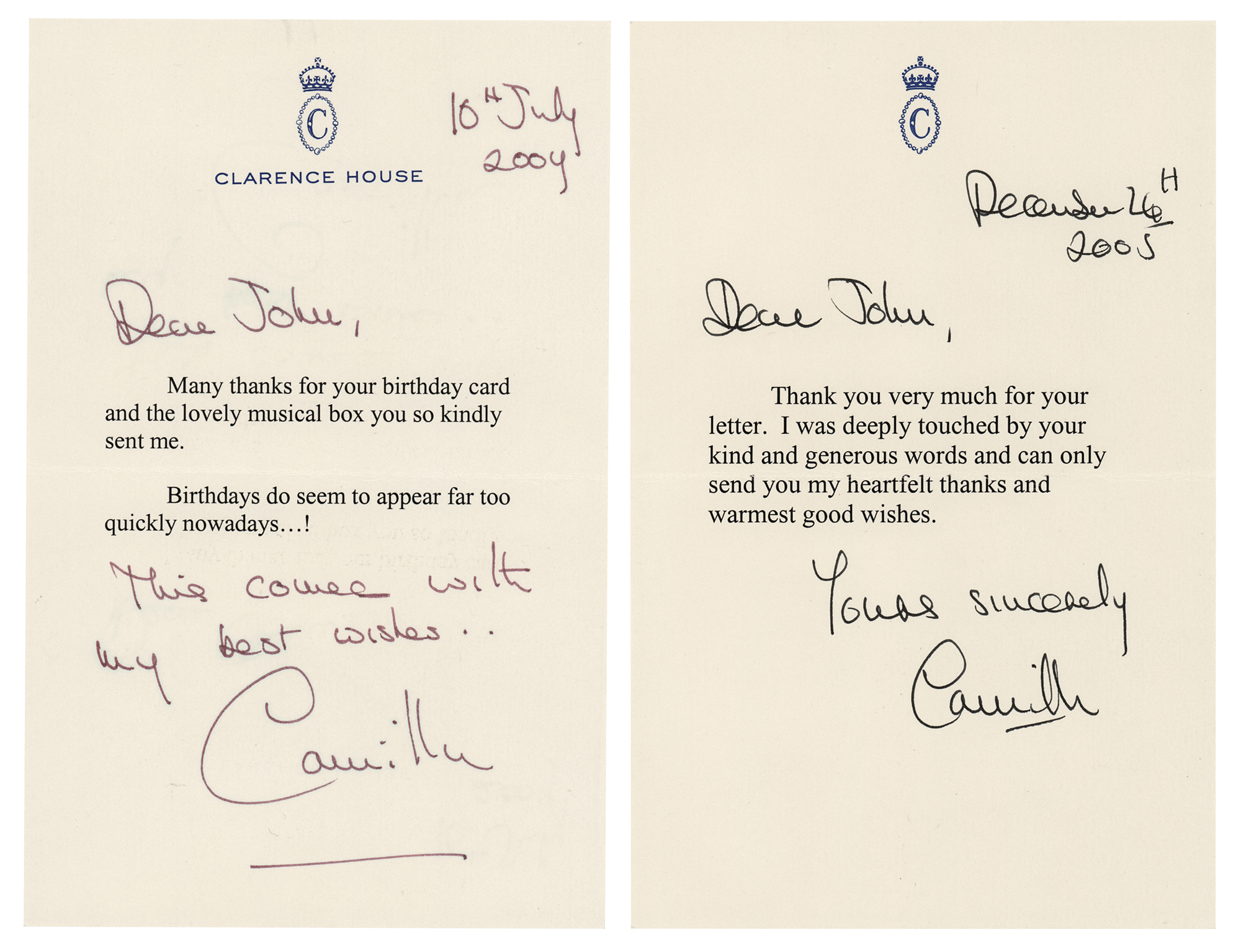 Two TLSs signed "Camilla," each one page, 4.75 x 7.25, Clarence House letterhead, dated July 10, 2004 and December 26, 2005. Camilla writes to "John," sending thanks for a "birthday card and the lovely musical box" and thanking him for "kind and generous words." In fine condition. Accompanied by both original mailing envelopes.