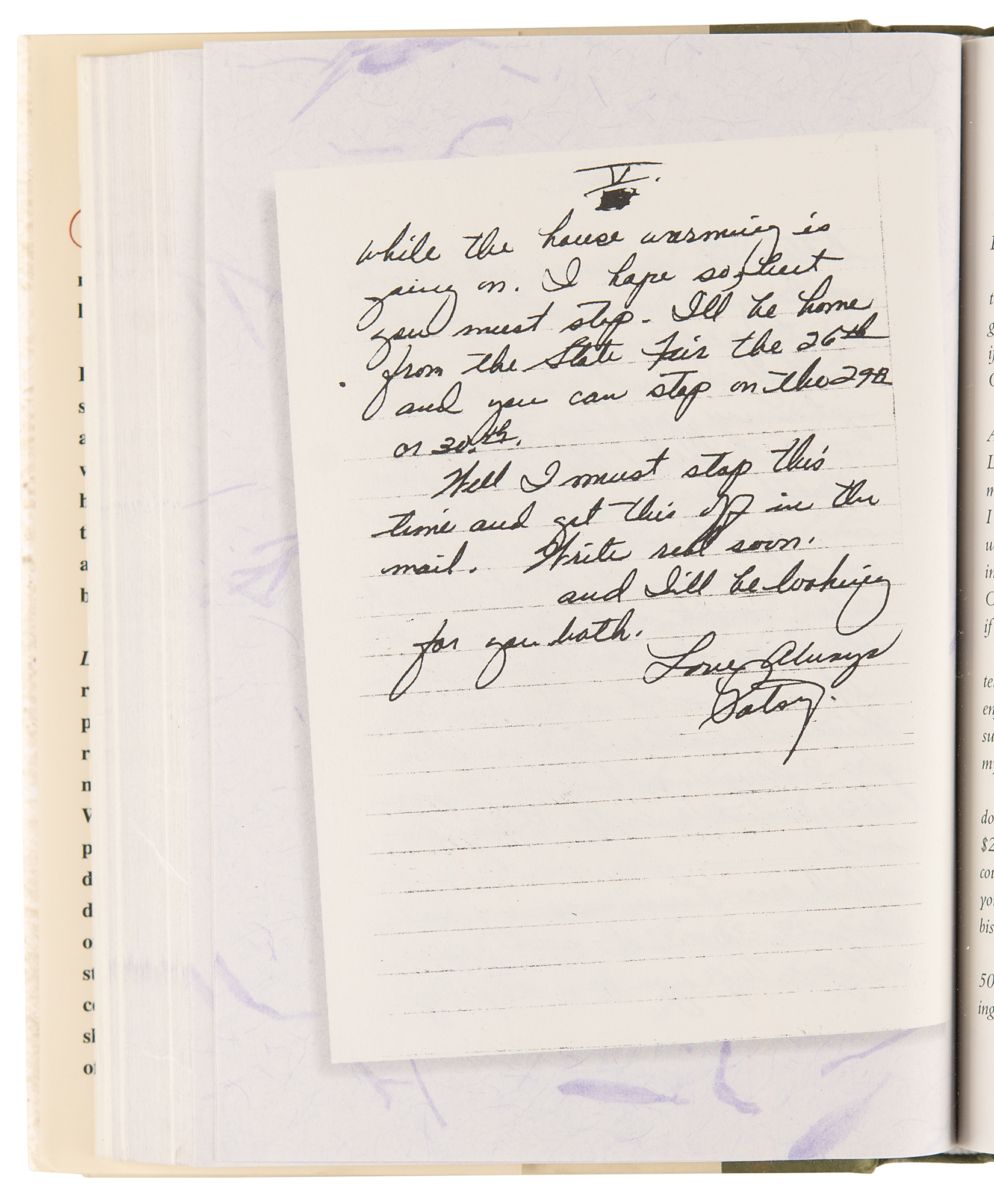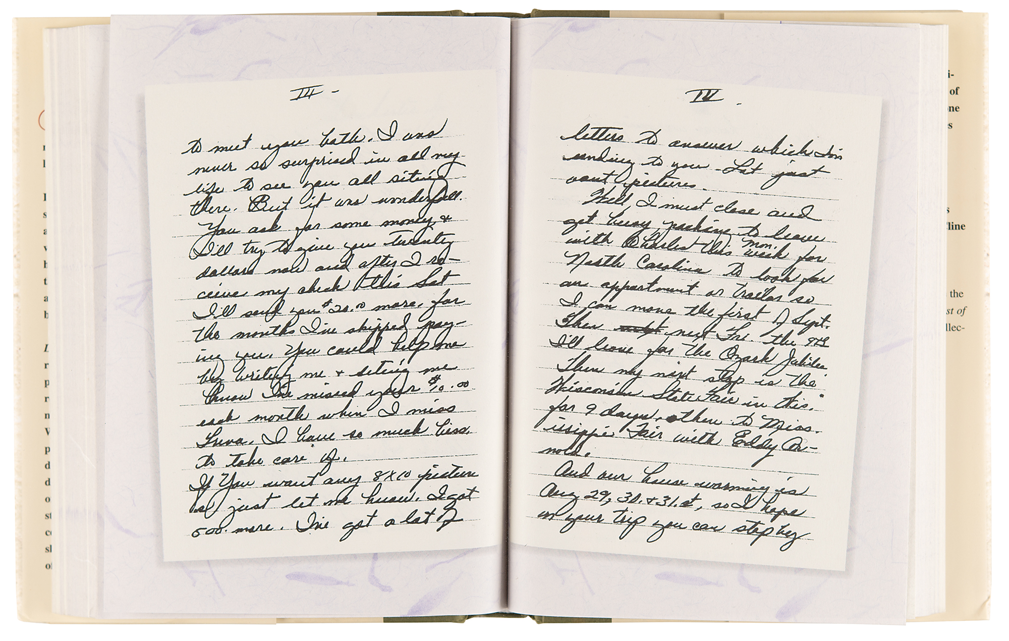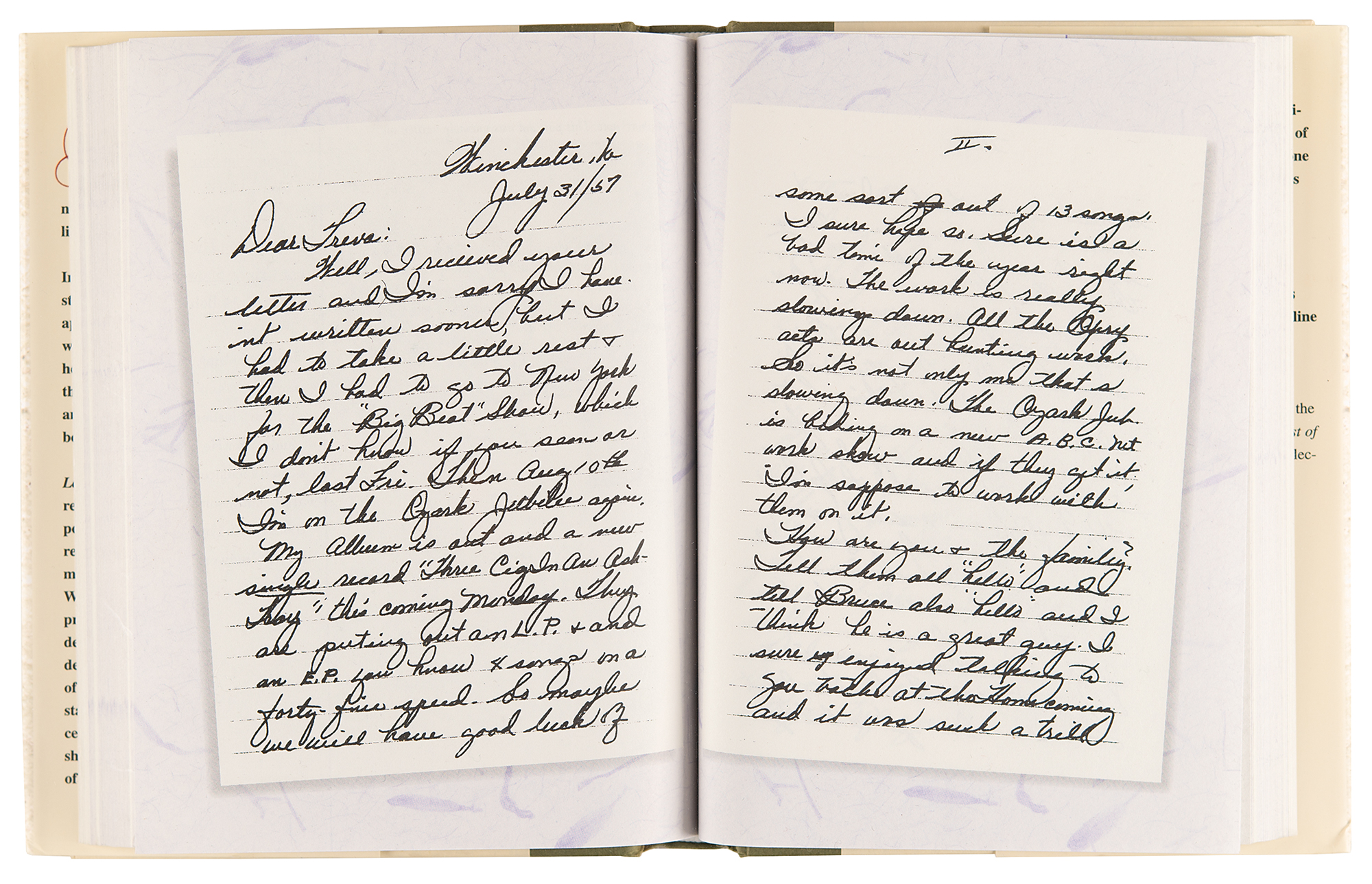 Wonderful ALS signed “Patsy,” five pages, 5.25 x 8.75, July 31, 1957. Addressed from Winchester, Virginia, a handwritten letter to her fan club president, Treva Miller, in part (spelling and grammar retained): "Well, I received your letter and I'm sorry I haven't written sooner, but I had to take a little rest & then I had to go to New York for the 'Big Beat' Show, which I don't know if you seen or not, last Fri. Then Aug 10th I'm on the Ozark Jubilee again. My Album is out and a new single record 'Three Cig In An Ash-Tray' this coming Monday. They are puting out an L.P. & and an E.P. you know 4 songs on a forty-five speed. So maybe we will have good luck of some sort of out of 13 songs. I sure hope so. Sure is a bad time of the year right now. The work is really slowing down. All the Opry acts are out hunting work. So it's not only me that's slowing down. The Ozark Jub. is biding on a new A.B.C. net work show and if they get it, I'm sappose to work with them on it. How are you & the family? Tell them all 'hello' and tell Bruce also 'hello'…You ask for some money & I'll try to give you twenty dollars now and after I receive my check this Sat I'll send you $20.00 more for the months I've skipped paying you. You could help me by writing me & leting me know I've missed your $10.00 each month when I miss Treva. I have so much buiss to take care of. If you want any 8x10 pictures just let me know. I got 500 more. I've got a lot of letters to answer which I'm sending to you. Lot just want pictures. Well, I must close and get busy packing to leave with Charles this Mon, week for North Carolina to look for an appartment or trailor so I can move the first of Sept. Then next Fri. the 9th I'll leave for the Ozark Jubilee. Then my next stop is the Wisconsin State Fair in Wis. For 9 days there to Mississippi Fair with Eddy Arnold. And our house warming is Aug 29, 30 & 31st, so I hope on your trip you can stop by while the house warming is going on. I hope so, but you must stop. I'll be home from the State Fair the 26th and you can stop on the 29th or 30th. Well I must stop this time and get this off in the mail. Write real soon and I'll be looking for you both.” In fine condition. Accompanied by the original mailing envelope hand-addressed by Cline, who incorporates her signature into the upper left return address field, and a first edition of the book Love Always, Patsy: Patsy Cline’s Letters to a Friend, which features this very offered letter.