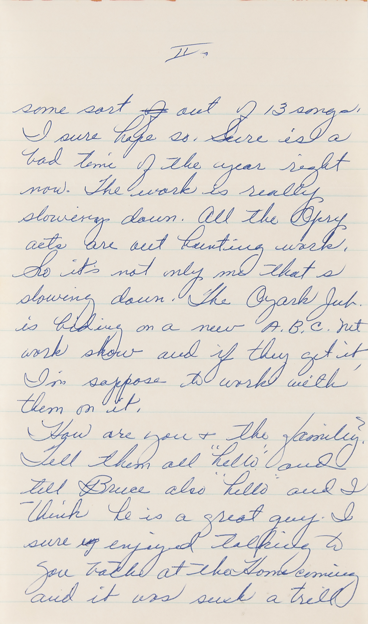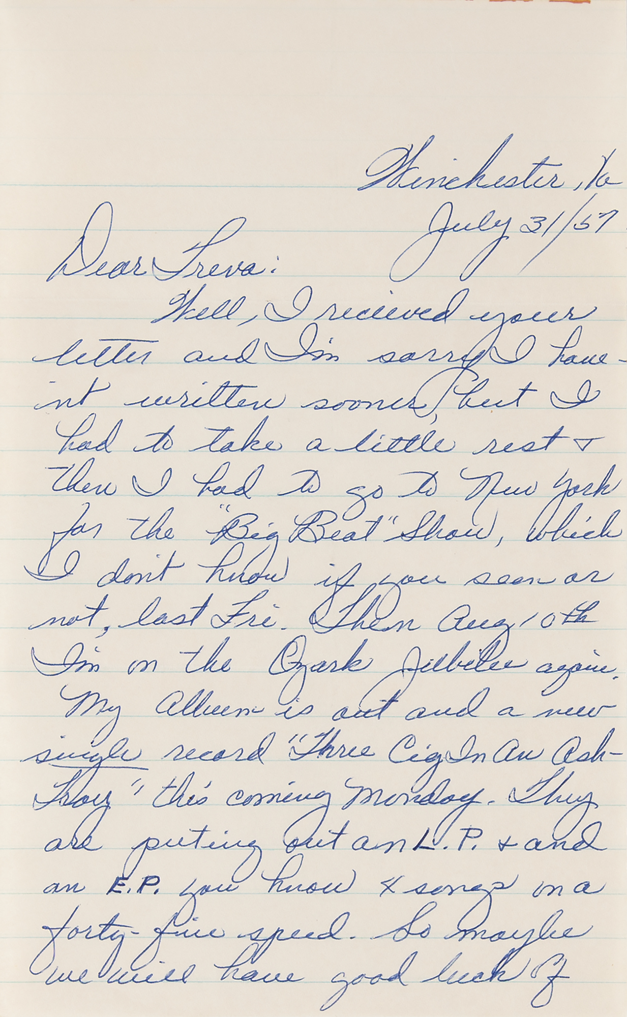 On September 30, 1954, 22-year-old Patsy Cline signed her first recording contract with Four Star Music Sales of Pasadena, California. In turn, Four Star arranged a leasing and distribution deal with Decca Records. All but two of her recording sessions were produced by Owen Bradley in his Nashville studios. The two exceptions were the sessions of April 24-25, 1957, which were produced by Paul Cohen and held at the Pythian Temple Studios in New York City. Four songs were recorded each day. The four recorded on April 25th were ‘Try Again,’ ‘Too Many Secrets,’ ‘Then You'll Know,’ and ‘Three Cigarettes (in an Ashtray),’ the latter referred to in this letter. The Ryman Auditorium in Nashville was the home of the Grand Ole Opry from 1943-1974. The Opry then moved to the Grand Ole Opry House where it is still located, but shows honoring Patsy Cline are held at the Ryman. Ozark & Jubilee was a television show hosted by Red Foley from 1955-1961. It was first televised on Saturday evenings from 7:30 P.M. to 9 P.M. Every fourth week, a show called Grand Ole Opry was broadcast.