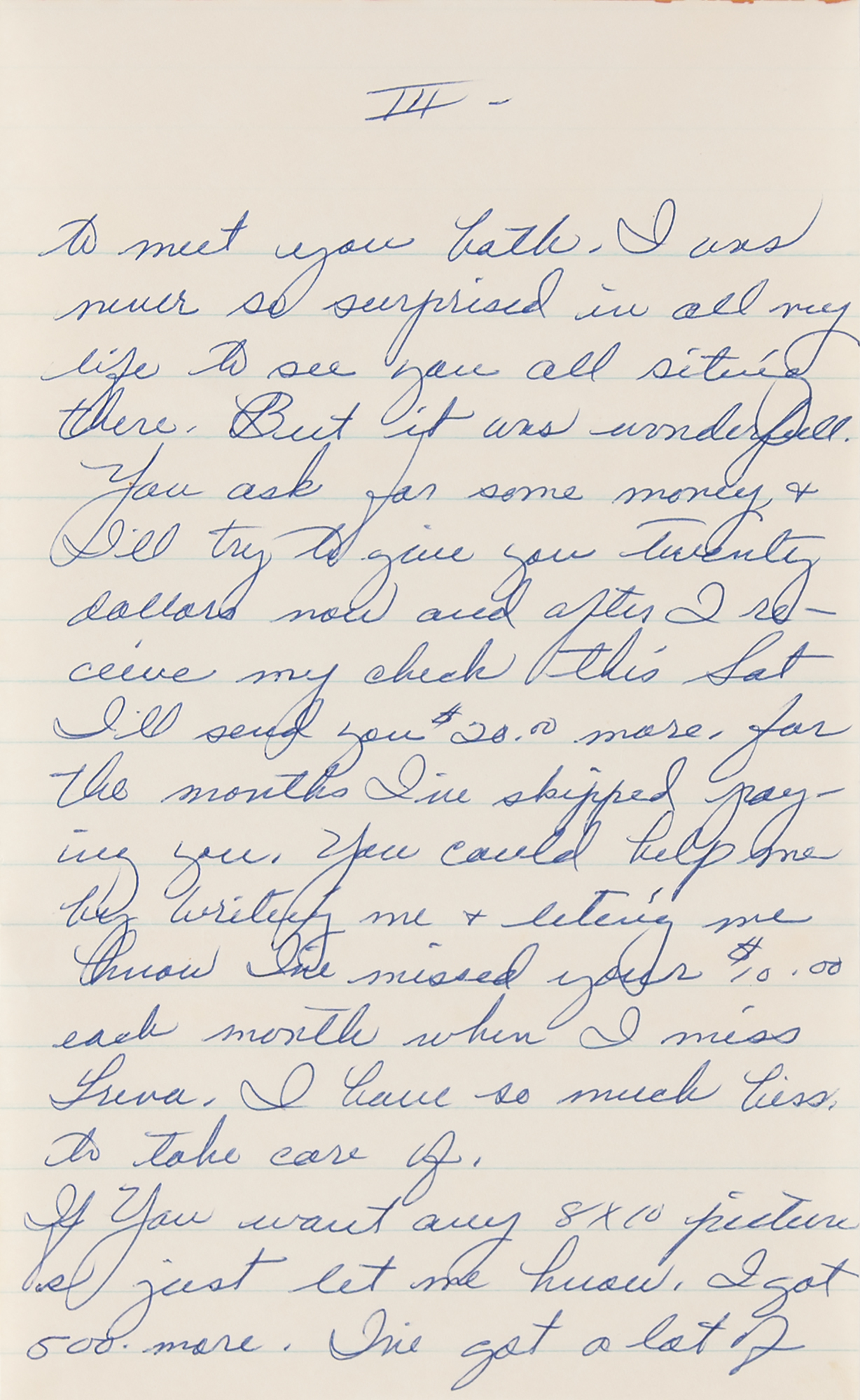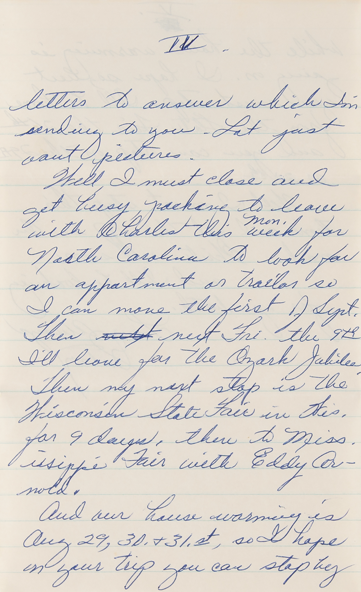 Cline writes that she is leaving with Charles for North Carolina. In 1953, Virginia Patterson ‘Patsy’ Hensley married Gerald Cline. Her marriage ended in divorce. On September 15, 1957, six and a half weeks after she wrote this letter, she married Charles Dick. In 1958 and 1959, her husband joined the Army and Patsy gave birth to her daughter, Julia. She returned to work after Charles returned from the Army and accepted a regular spot in the Grand Ole Opry. Her Four Star contract ran out and she was signed by Decca. Her many hits with Decca include ‘Crazy,’ ‘I Fall to Pieces,’ ‘She's Got You,’ and ‘Faded Love.’