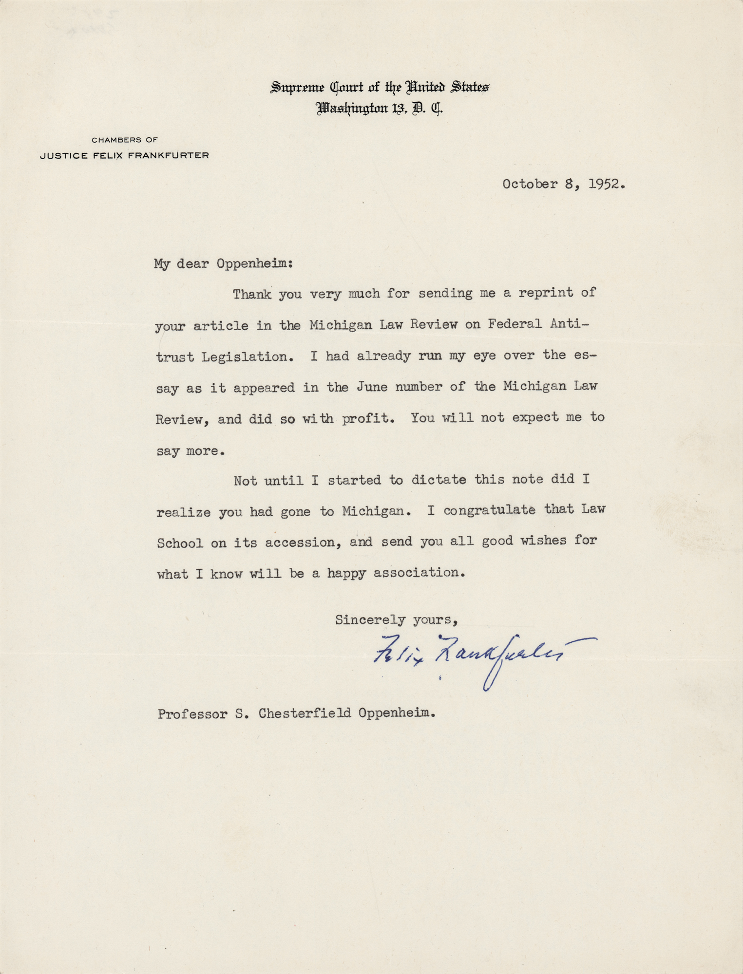 TLS, one page, 8 x 10.5, personal Supreme Court of the United States letterhead, October 8, 1952. Letter to Professor S. Chesterfield Oppenheim, in full: “Thank you very much for sending me a reprint of your article in the Michigan Law Review on Federal Anti-trust Legislation. I had already run my eye over the essay as it appeared in the June number of the Michigan Law Review, and did so with profit. You will not expect me to say more. Not until I started to dictate this note did I realize you had gone to Michigan. I congratulate that Law School on its accession, and send you all good wishes for what I know will be a happy association.” In fine condition.