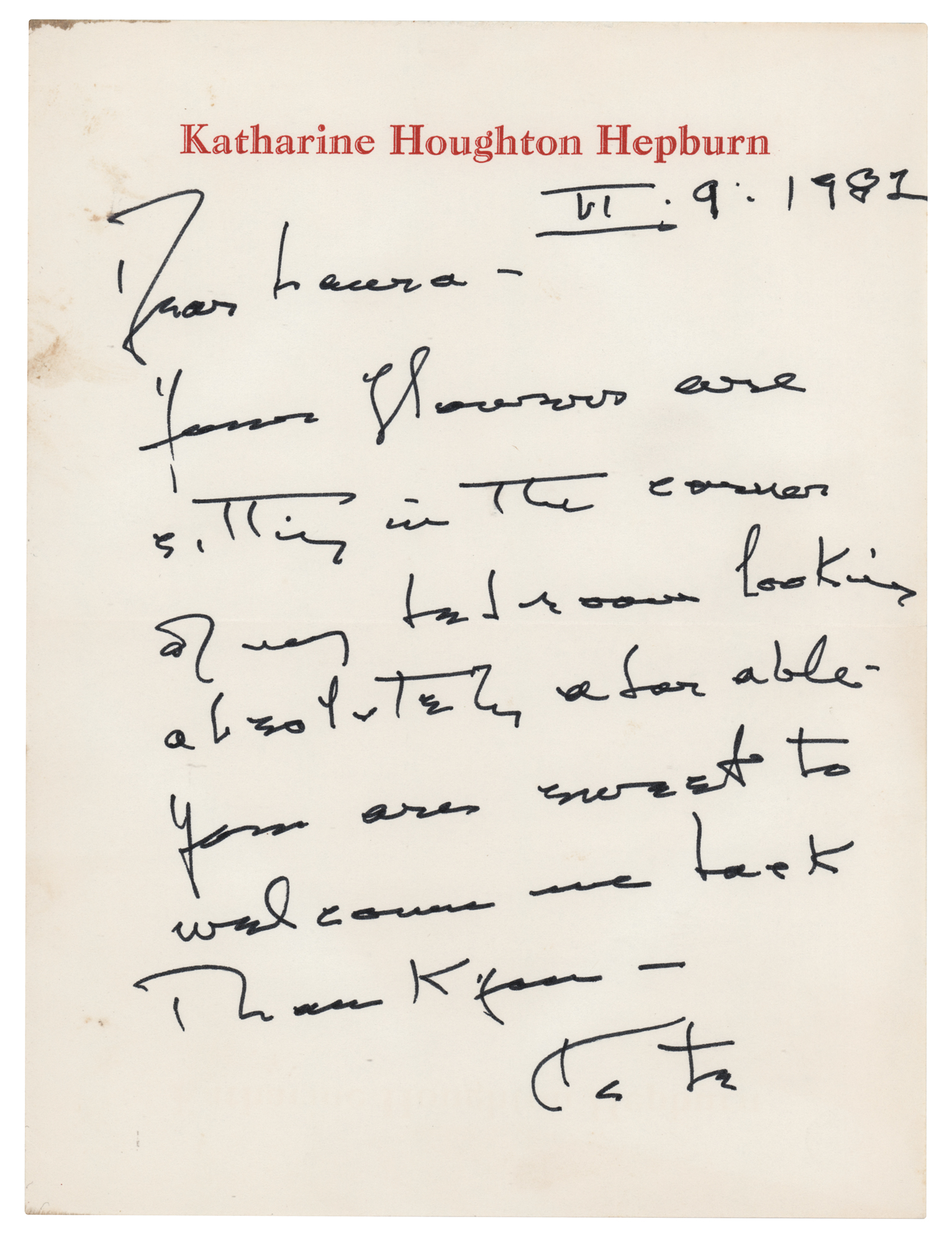 ALS signed “Kate,” one page, 6 x 8, personal letterhead, June 9, 1982. Handwritten letter to pianist Laura Dubman, who worked with Hepburn during the production of the 1947 film Song of Love, in full: “Your flowers are sitting in the corner of my bedroom looking absolutely adorable. You are sweet to welcome me back. Thank you.” In fine condition, with a couple of small stains.