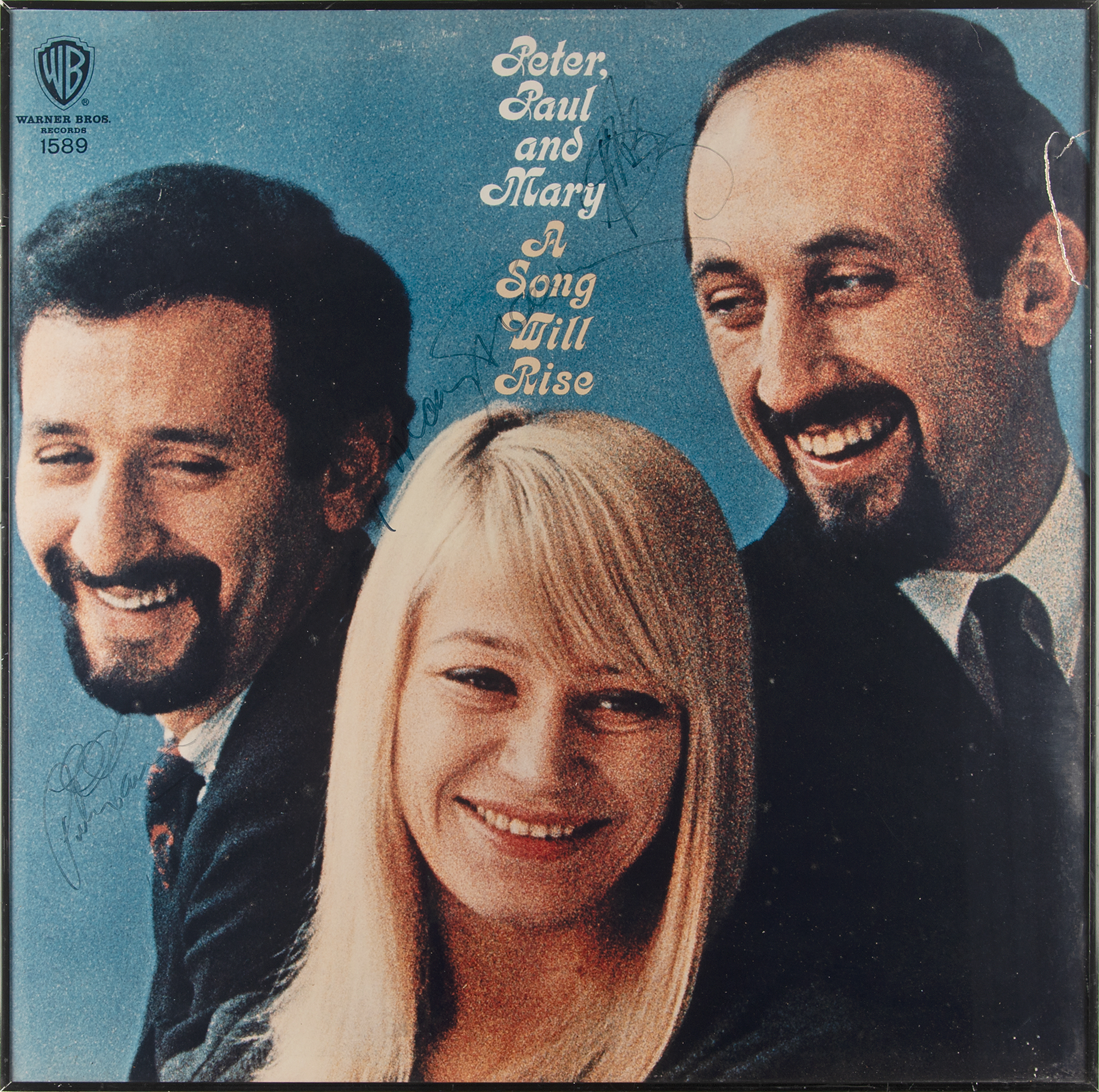 Large color 29.5 x 29.5 Warner Bros. Records poster for A Song Will Rise, the fourth studio album folk music trio Peter, Paul & Mary, signed in black felt tip by all three musicians: Peter Yarrow, Paul Stookey, and Mary Travers. Framed and in very good to fine condition, with cracks to the upper right corner touching Peter's ear.