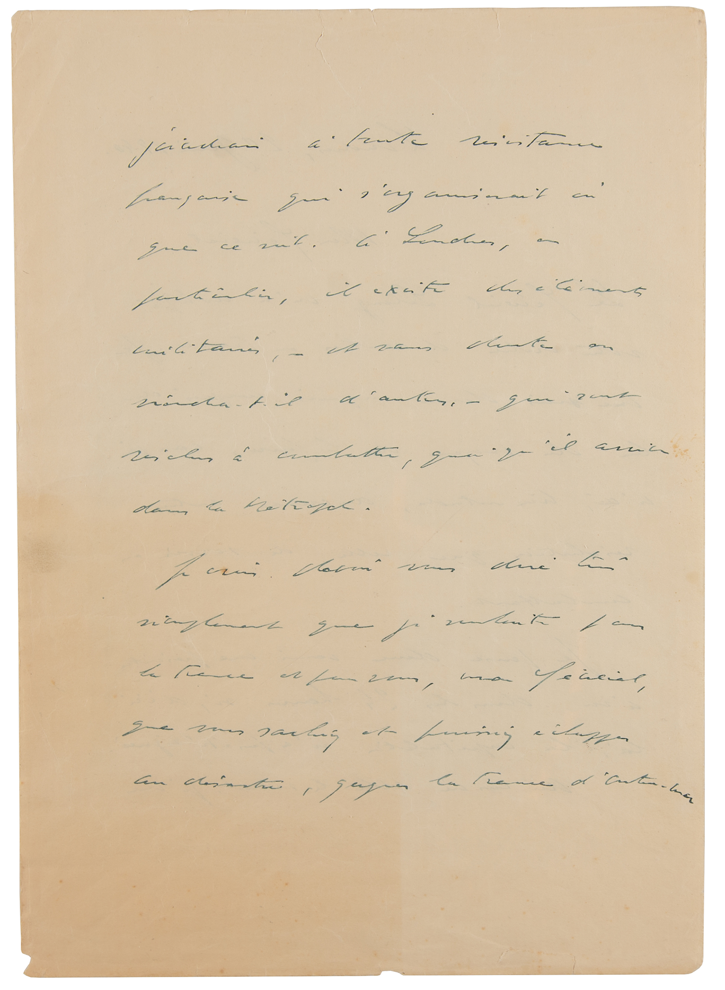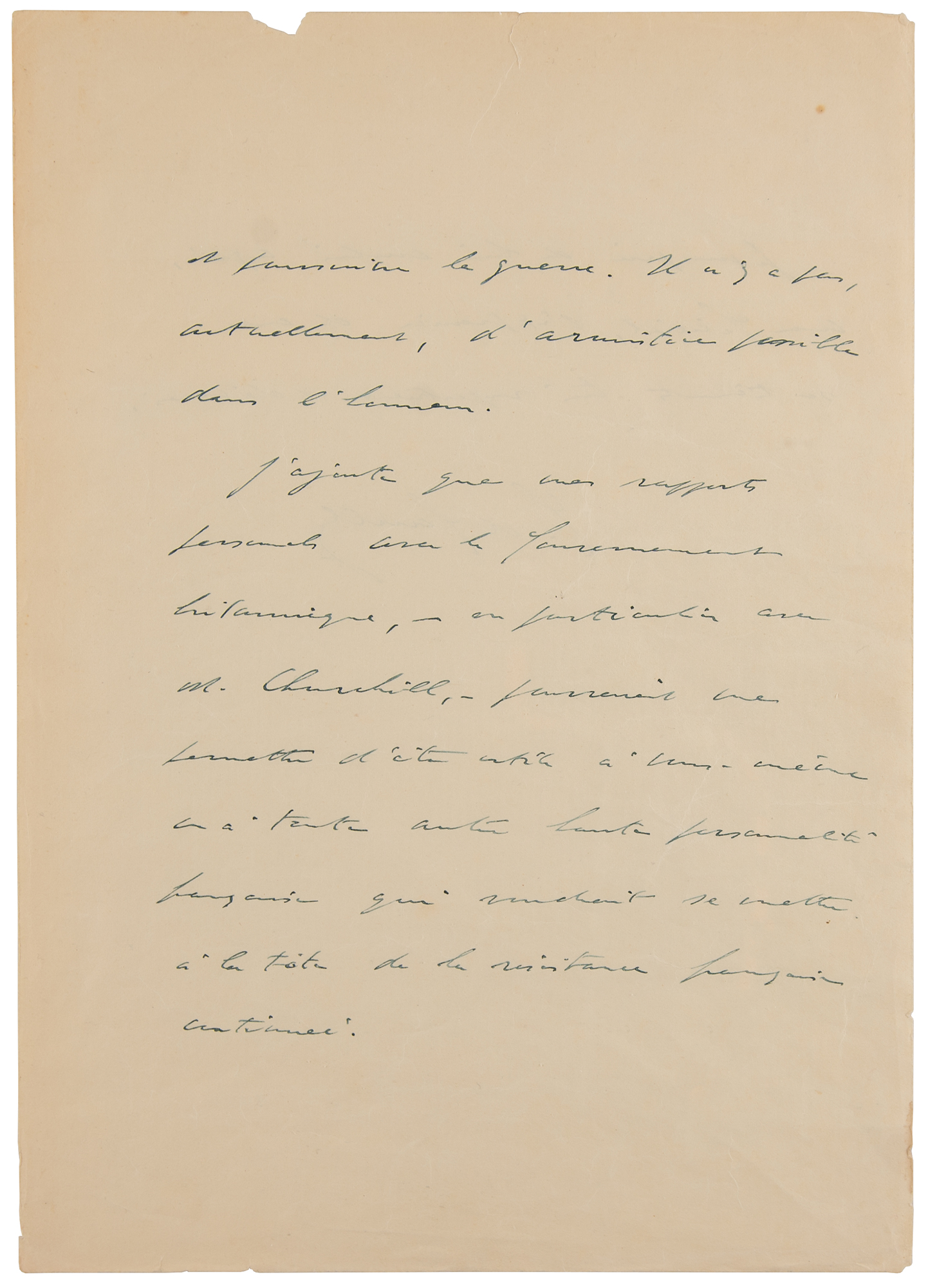 I would add that my personal relations with the British government, and in particular with Mr. Churchill, could enable me to be useful to you and to any other high French personality who would like to put himself at the head of the continued French resistance. Please accept, General, the expression of my most respectful and devoted feelings." In fine condition, with light creasing, and some small edge tears and chips.
