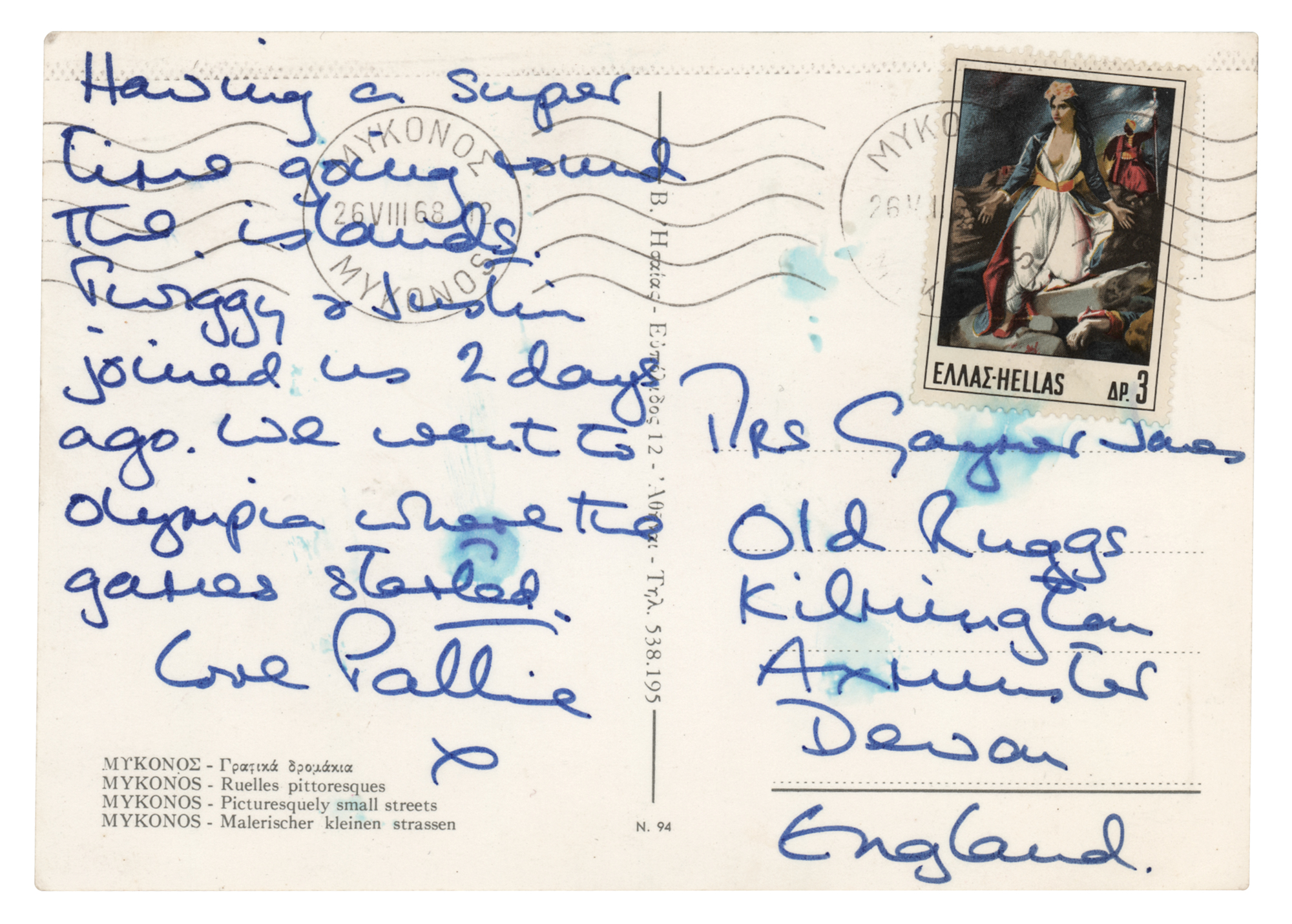 ALS signed “Pattie, x,” handwritten in blue felt tip on the reverse of a color glossy 5.75 x 4 postcard of streets on the Greek isle of Mykonos, postmarked from Mykonos on August 26, 1968. Boyd writes to her mother, Diana Gaymer-Jones, in full: “Having a super time going round The Islands. Twiggy & Justin joined us 2 days ago. We went to Olympia where the games started.” In fine condition, with a few small stains. Accompanied by a certificate of authenticity from Tracks. On August 17, 1968, George Harrison and Pattie Boyd flew to Greece for a brief holiday. They were accompanied on the trip by The Beatles’ assistant Mal Evans and were later joined by Twiggy and her boyfriend/manager, Justin de Villeneuve
