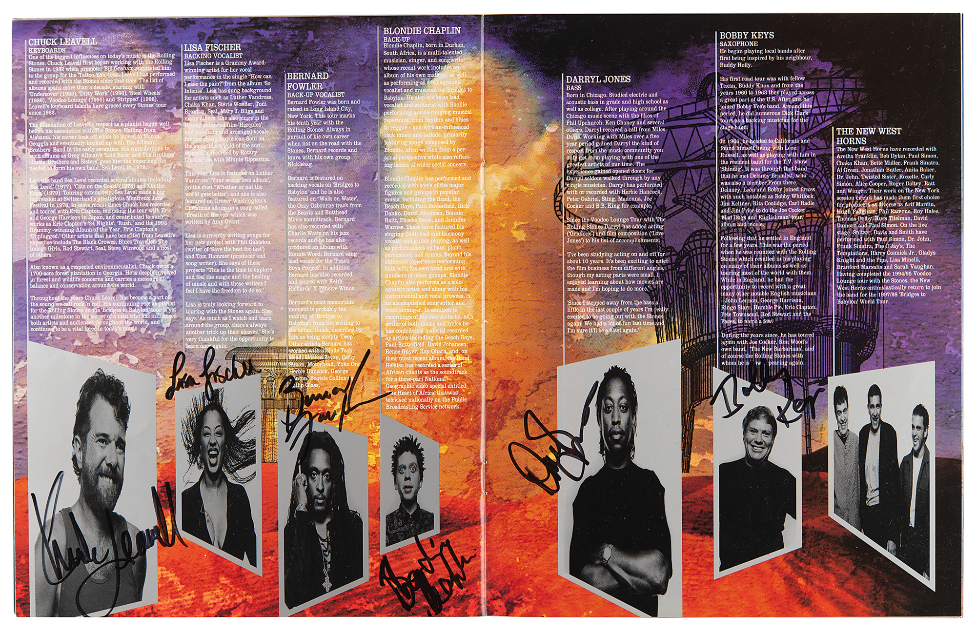 Original program for the Rolling Stones’ Bridges to Babylon World Tour of 1997-1998, 9.25 x 11.75, signed on the front cover in black felt tip, “Mick Jagger” and “Love, Keith Richards, ‘97,” and inside the program on their respective musician pages, “Love, Charlie Boy, 97” and “Ronnie Wood, 97,” who adds a heart. The program is also signed by six members of the backing group: Chuck Leavell, Lisa Fischer, Bernard Fowler, Blondie Chaplin, Darryl Jones, and Bobby Keys. The consignor notes that this signed program was originally obtained from Keith Richards' daughter, Angela. In very fine condition. Accompanied by a certificate of authenticity from Tracks.