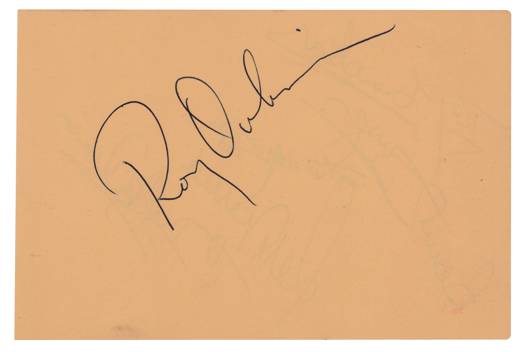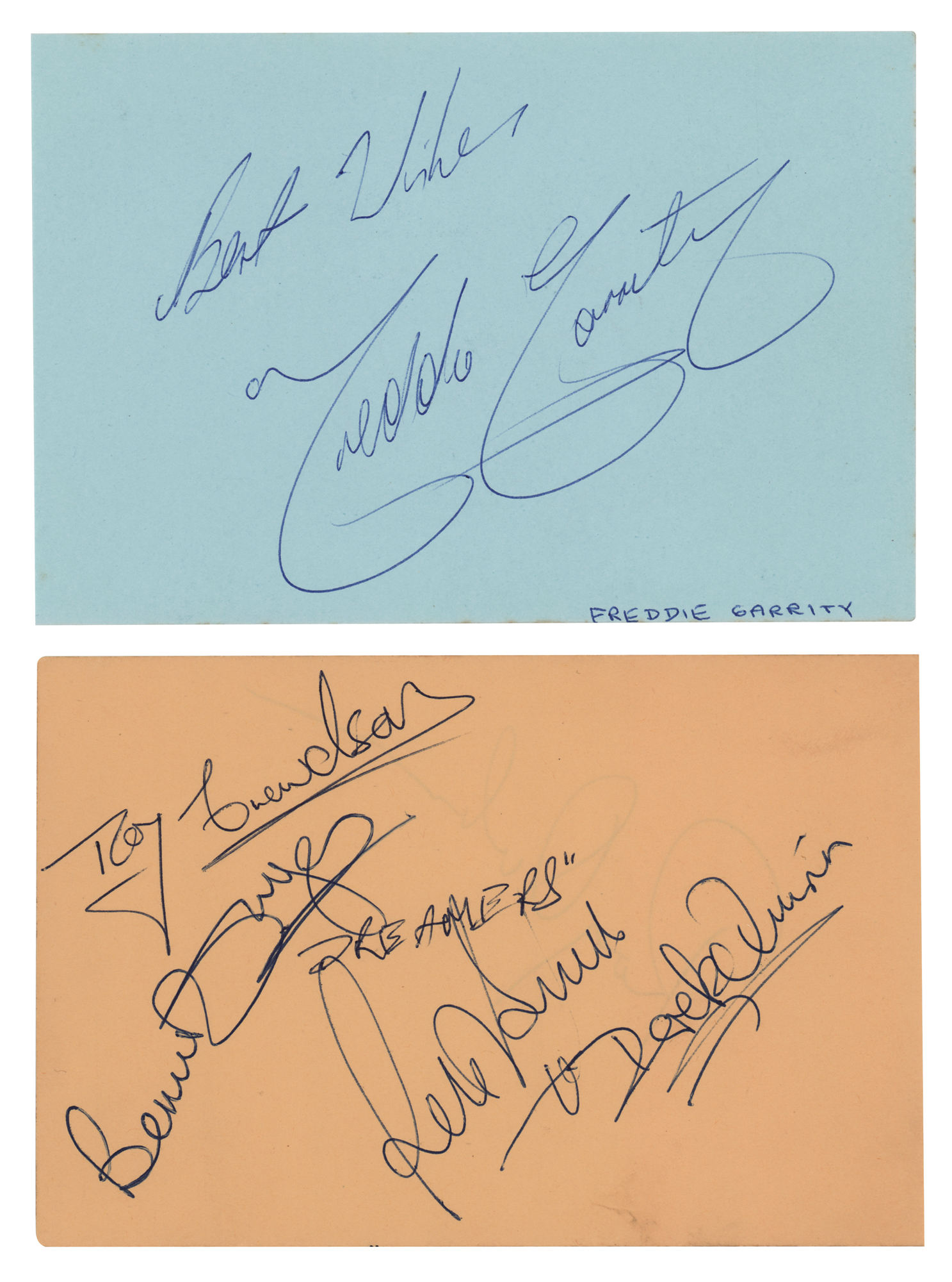 Vintage ballpoint signature, “Roy Orbison,” on a yellow 6 x 4 album page, the reverse of which is signed by four members of Freddie and the Dreamers: Derek Quinn, Roy Crewdson, Pete Birrell, and Bernie Dwyer. Included is a ballpoint signature of Freddie Garrity on a light blue 6 x 4 album page. In overall fine condition. Accompanied by a certificate of authenticity from Tracks.